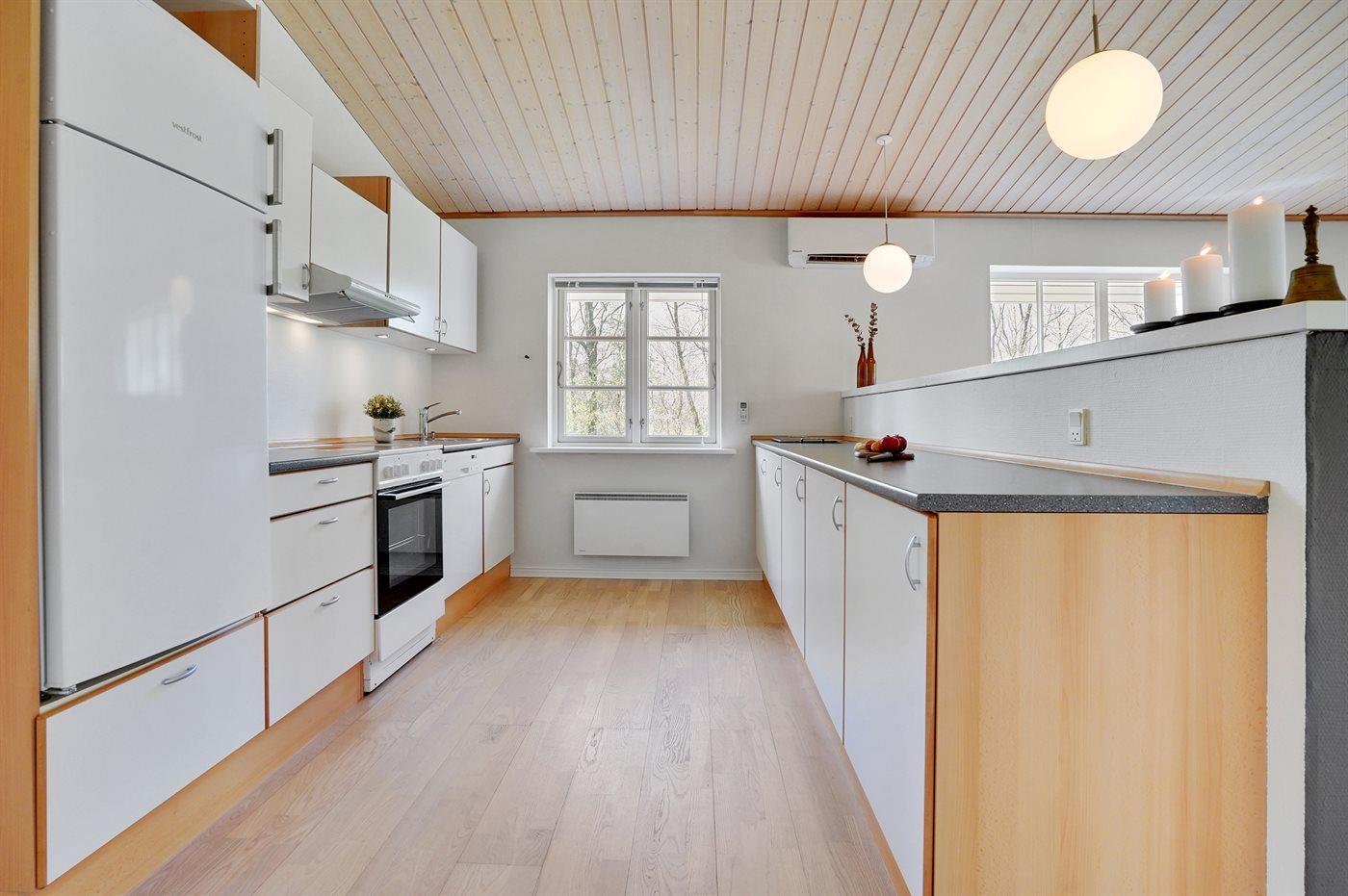 Køkkenet er udstyret med 1 køleskab. Der er 4 keramiske kogeplader, bageovn, mikrobølgeovn samt opvaskemaskine.