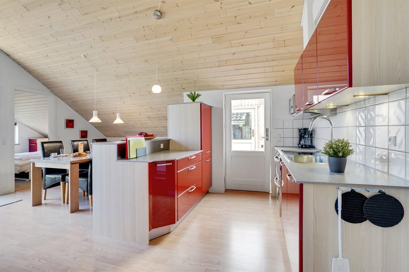 Køkkenet er udstyret med 1 køleskab. Der er 4 keramiske kogeplader, varmluftovn, mikrobølgeovn.