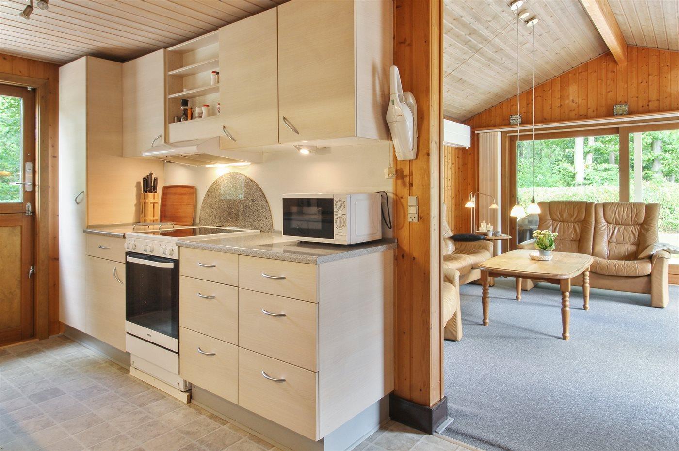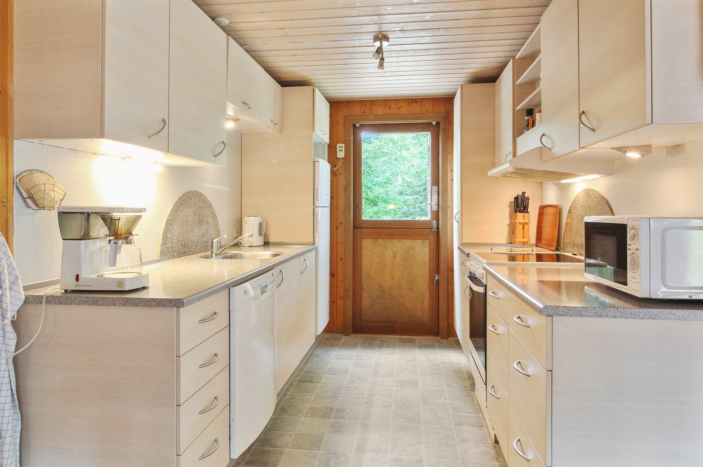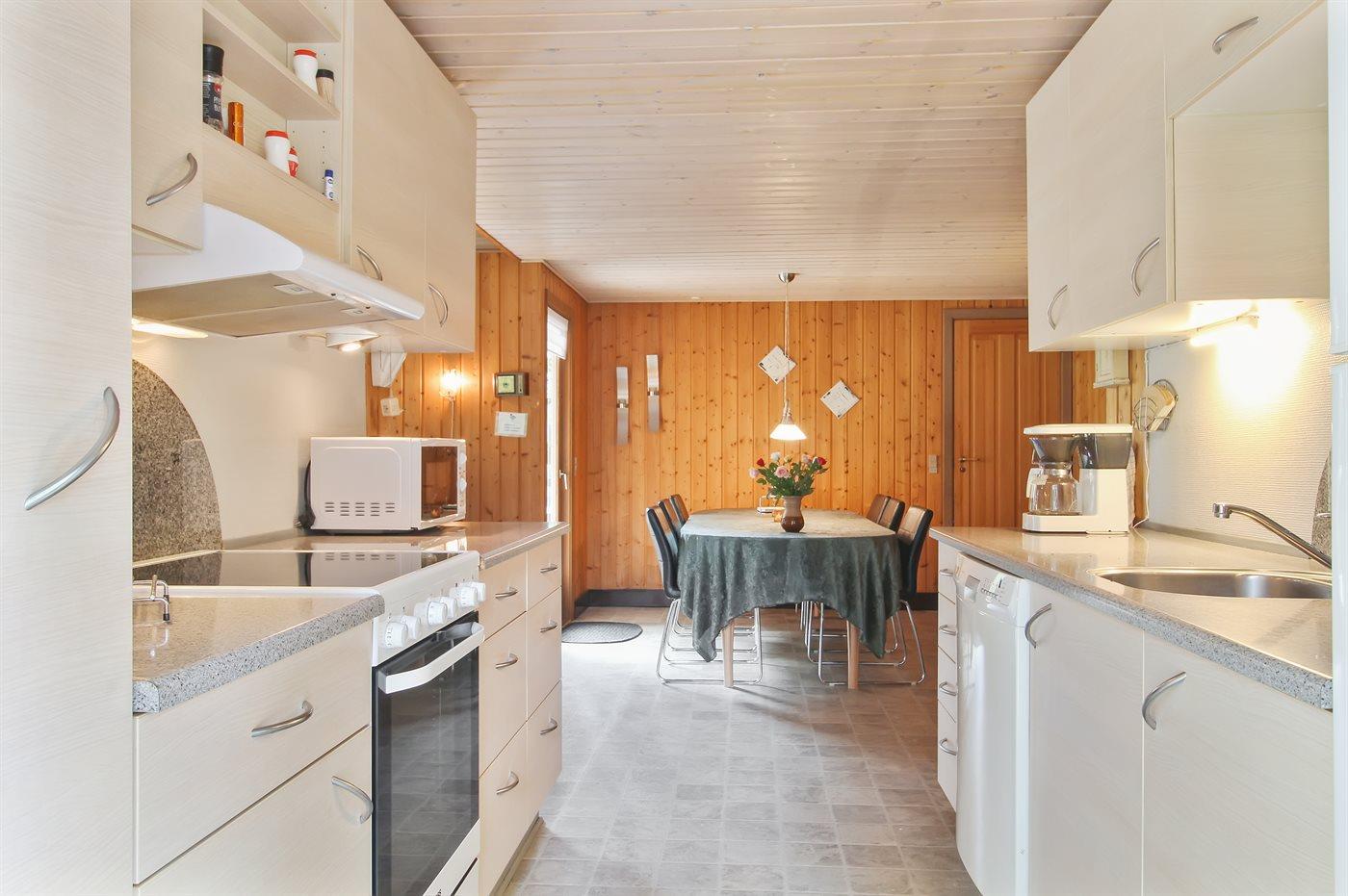 Køkkenet er udstyret med 1 køleskab. Der er 4 induktionskogeplader, varmluftovn, mikrobølgeovn samt opvaskemaskine.