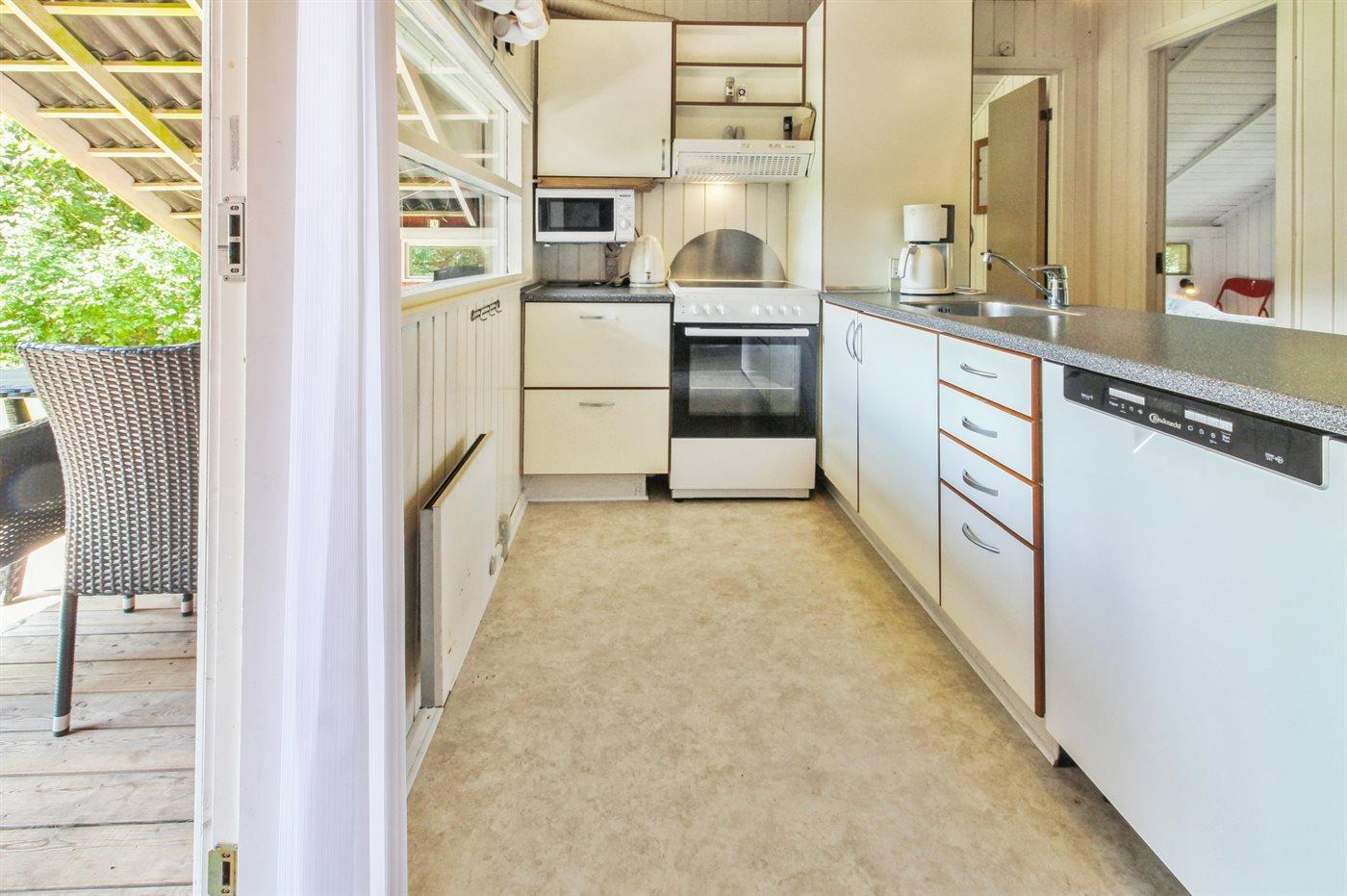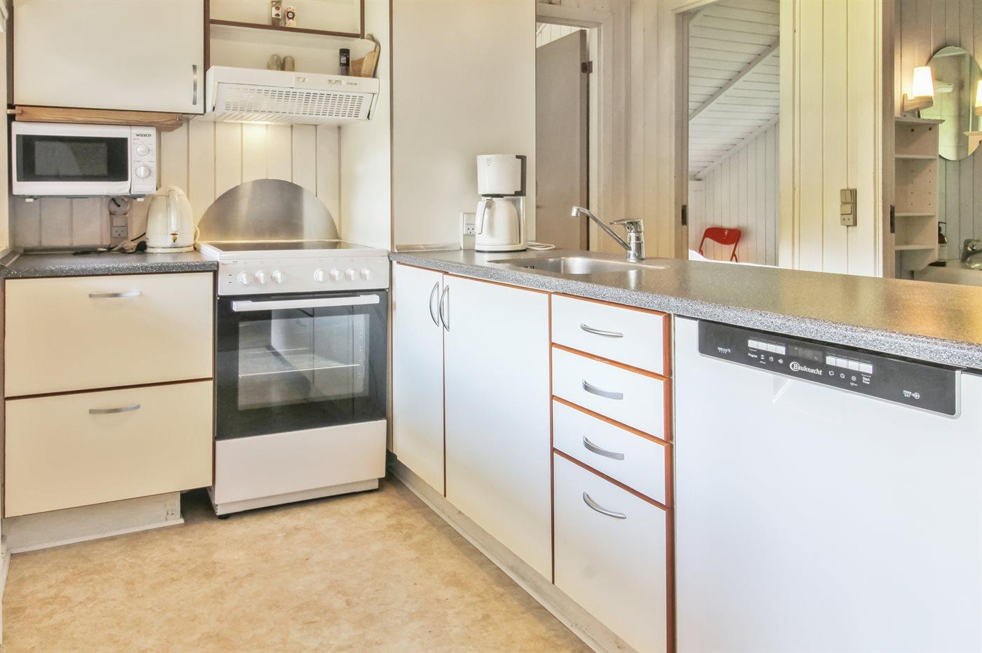 Køkkenet er udstyret med 1 køleskab. Der er 4 elkogeplader, bageovn, mikrobølgeovn samt opvaskemaskine.