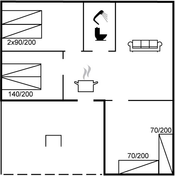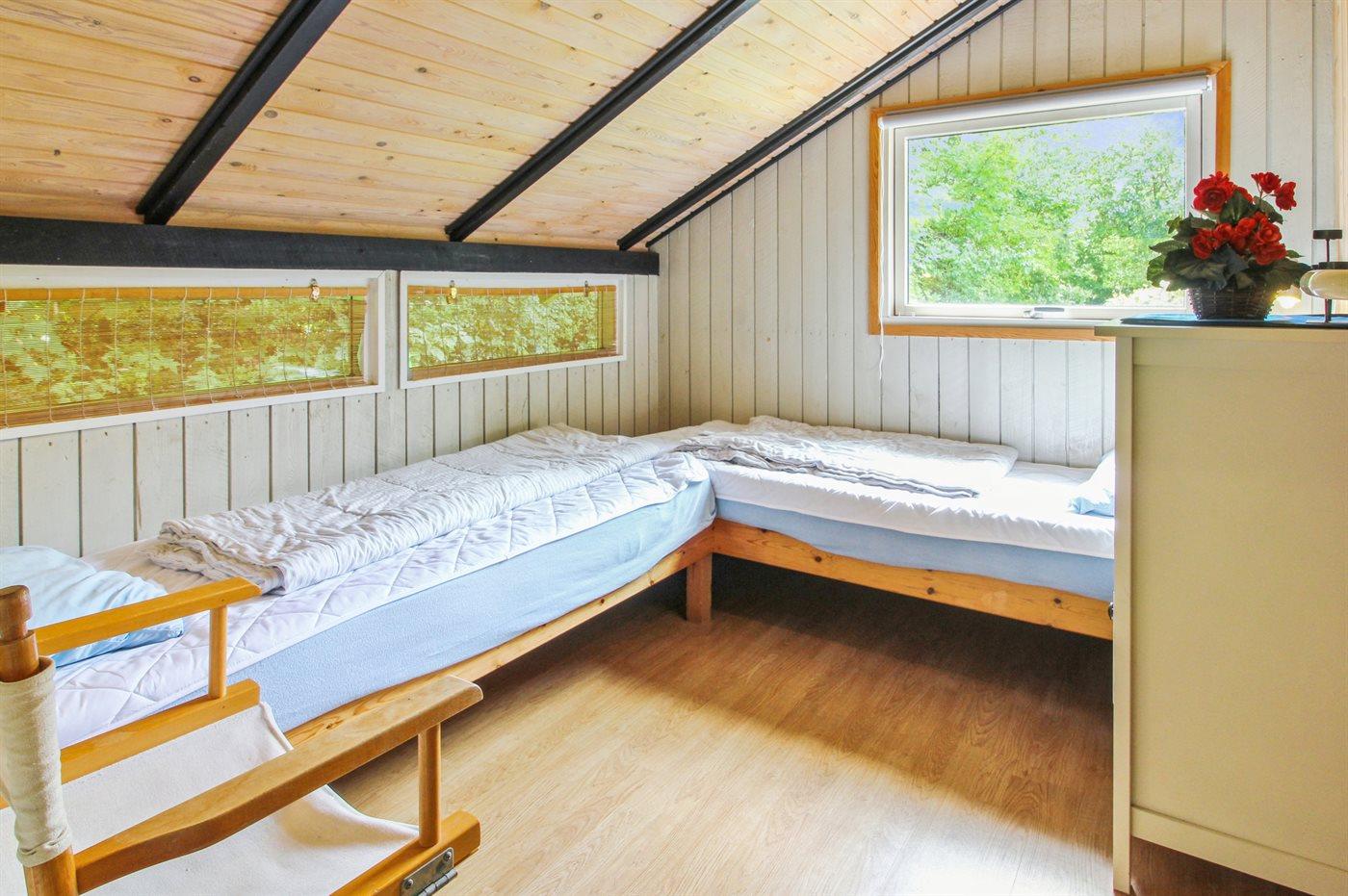 Der er i alt 3 soveværelser. Sovepladserne fordeler sig på: 4 sovepladser i dobbeltsenge. 2 sovepladser i enkeltsenge. Derudover er der 1 stk. barneseng.