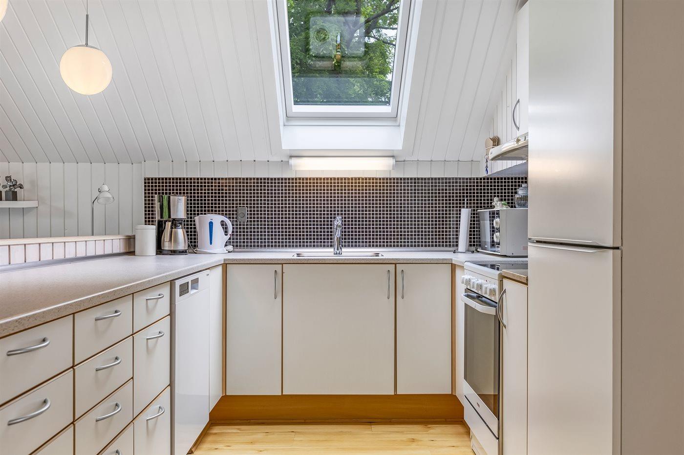 Køkkenet er udstyret med 1 køleskab. Der er 4 keramiske kogeplader, varmluftovn, mikrobølgeovn samt opvaskemaskine.