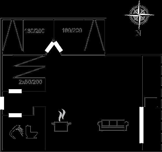 Der er i alt 3 soveværelser. Sovepladserne fordeler sig på: 4 sovepladser i dobbeltsenge. 2 sovepladser i enkeltsenge. Derudover er der 1 stk. barneseng.