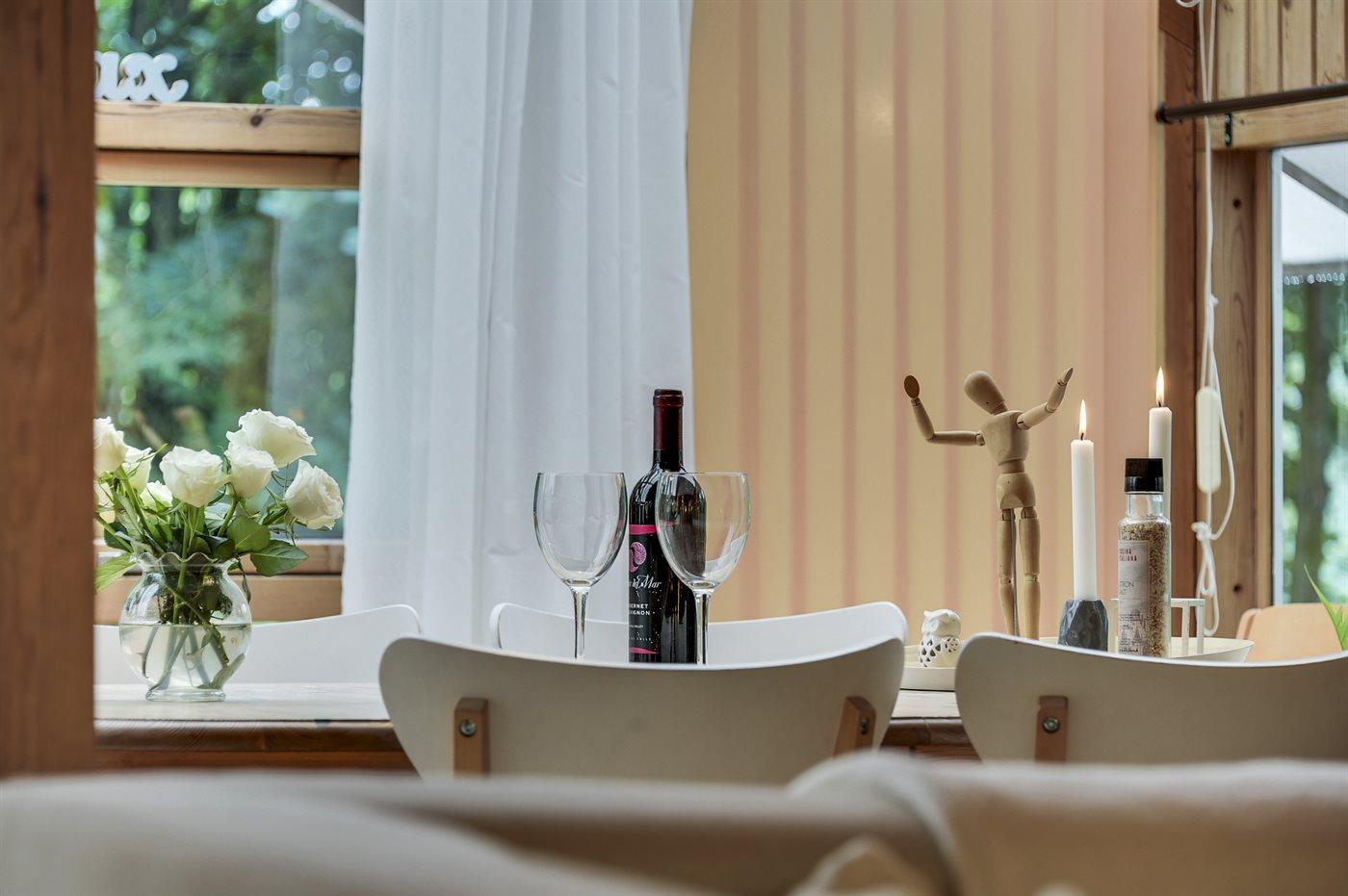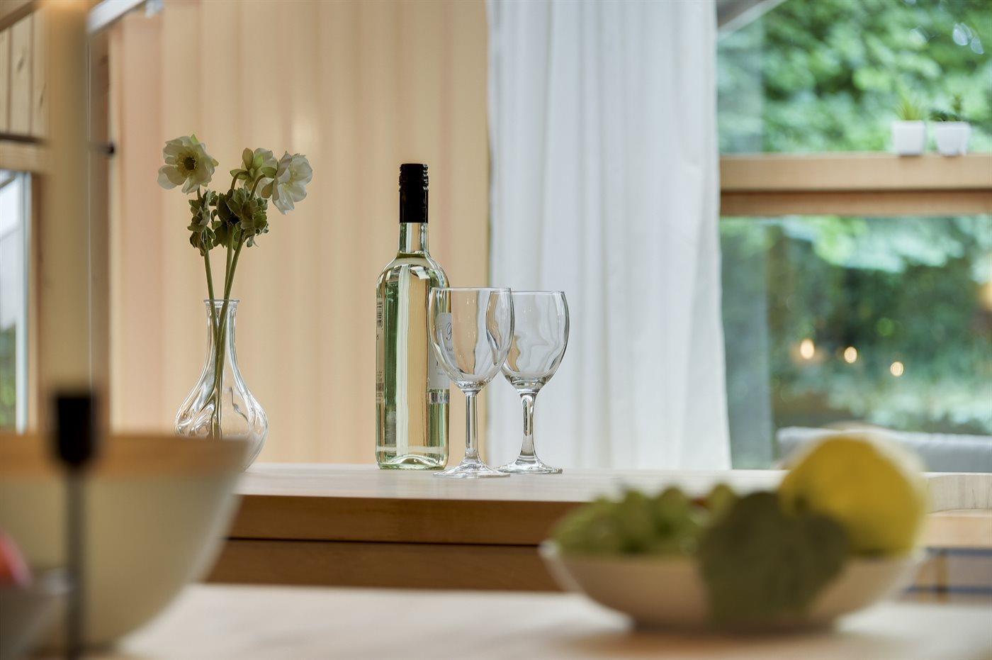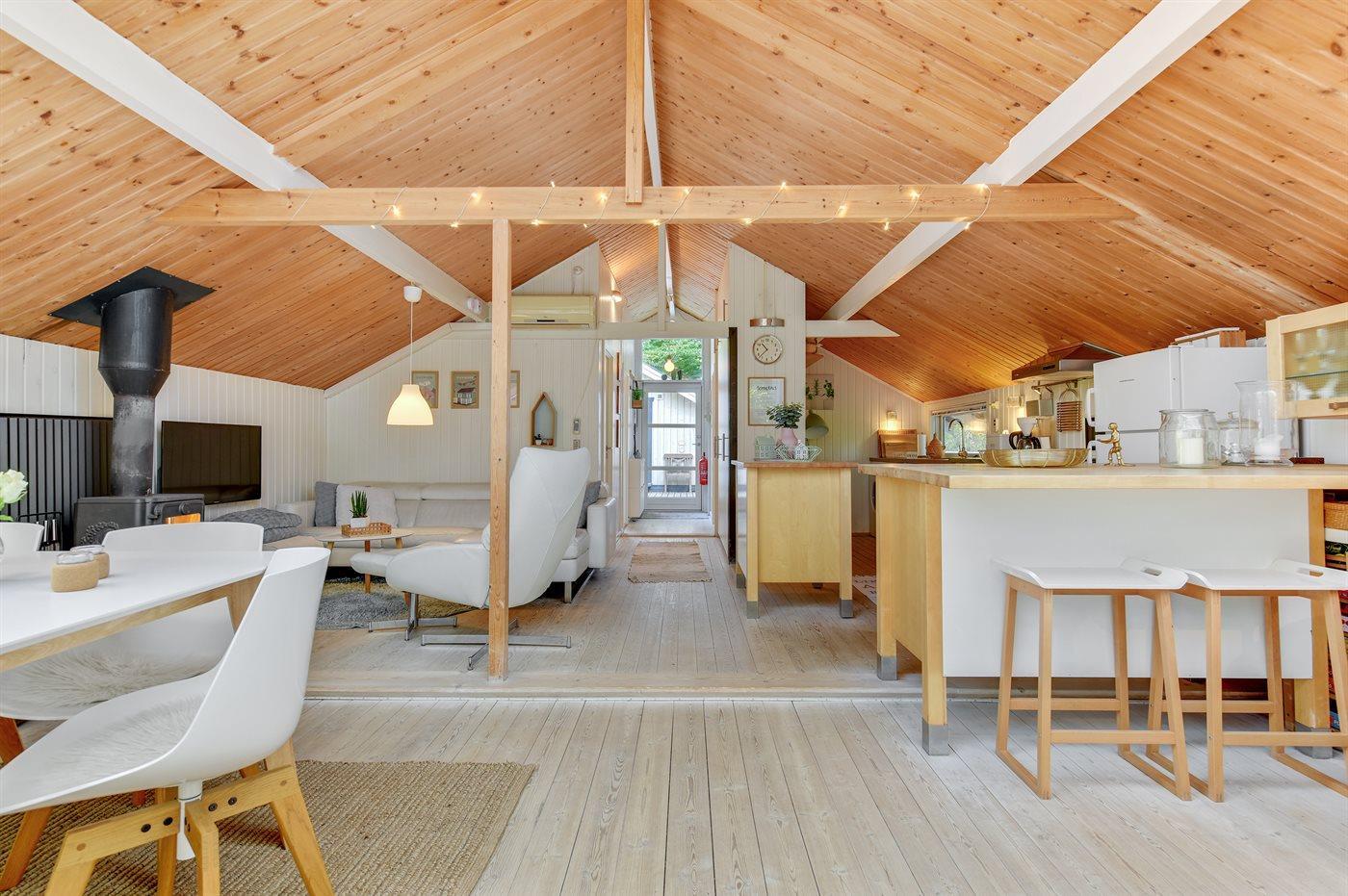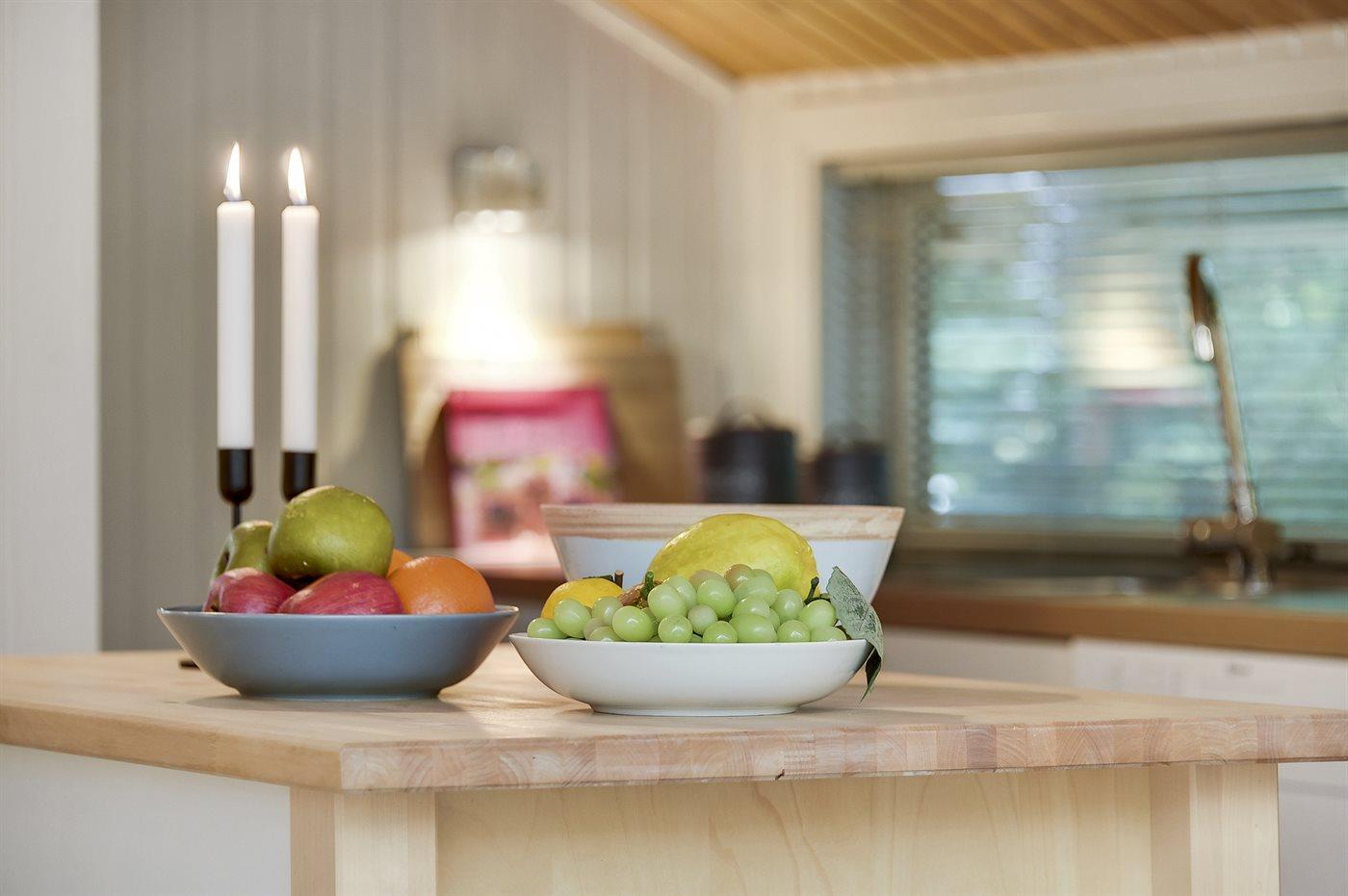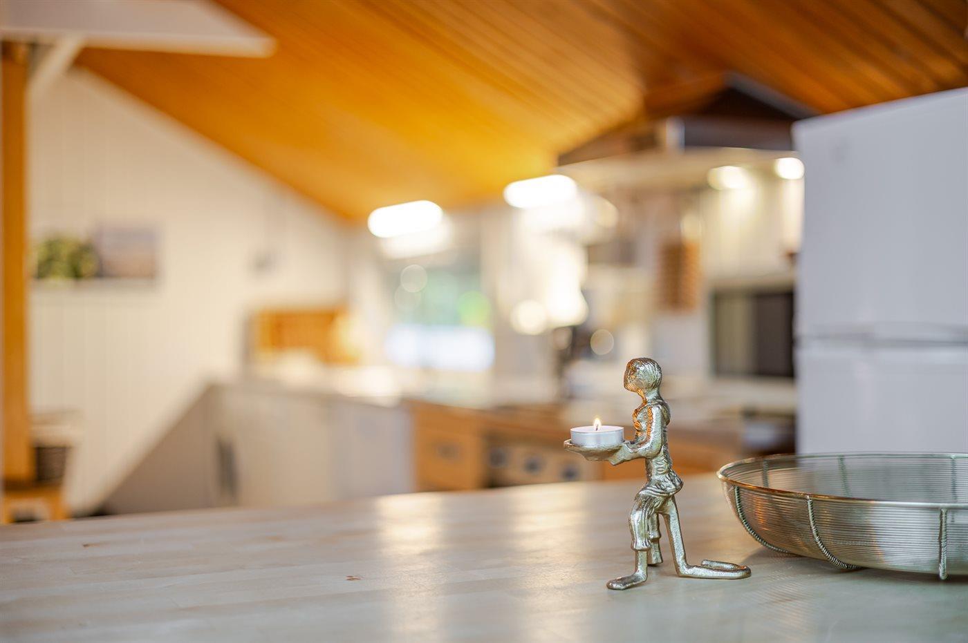 Køkkenet er udstyret med 1 køleskab. Der er 4 keramiske kogeplader, miniovn, varmluftovn samt opvaskemaskine.