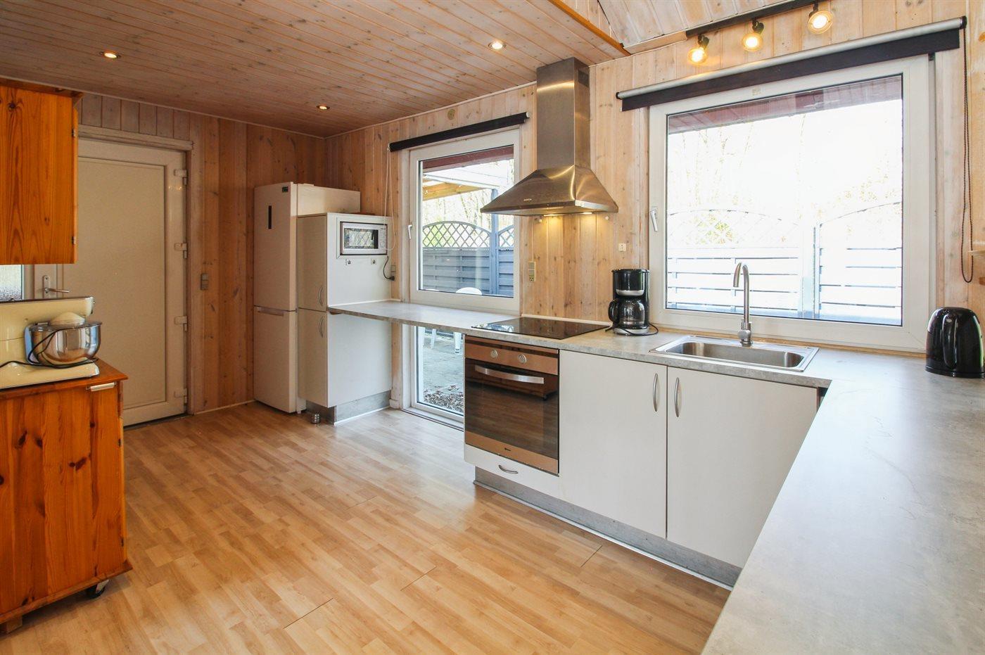 Køkkenet er udstyret med 1 køleskab. Der er 4 keramiske kogeplader, varmluftovn, mikrobølgeovn samt opvaskemaskine.