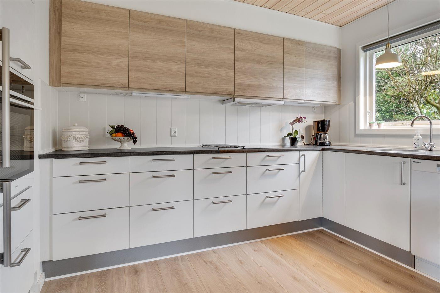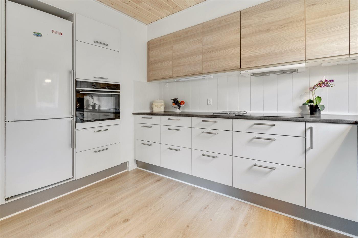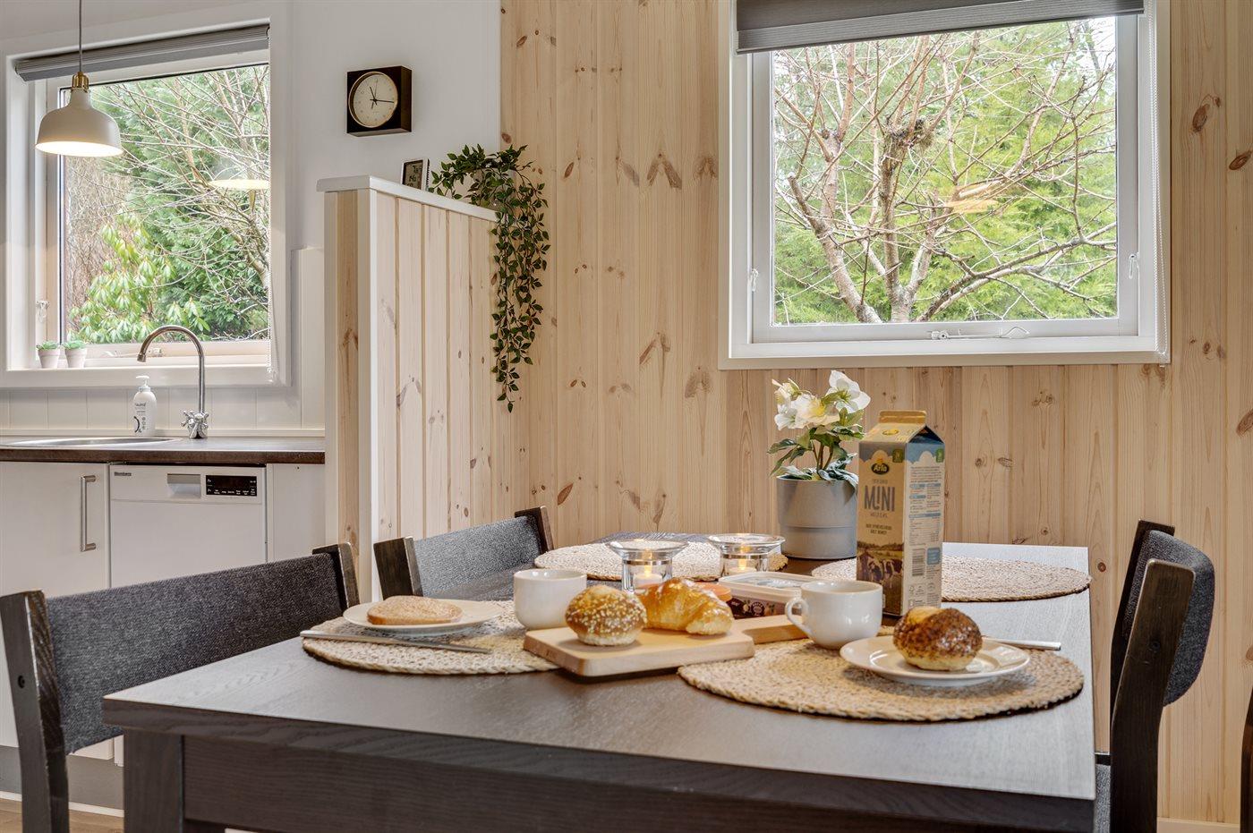 Køkkenet er udstyret med 1 køleskab. Der er 4 keramiske kogeplader, varmluftovn, mikrobølgeovn samt opvaskemaskine.
