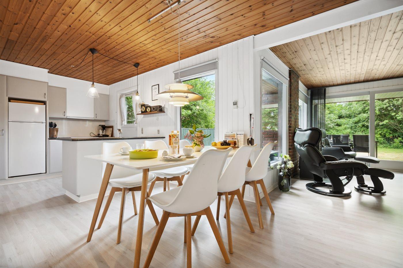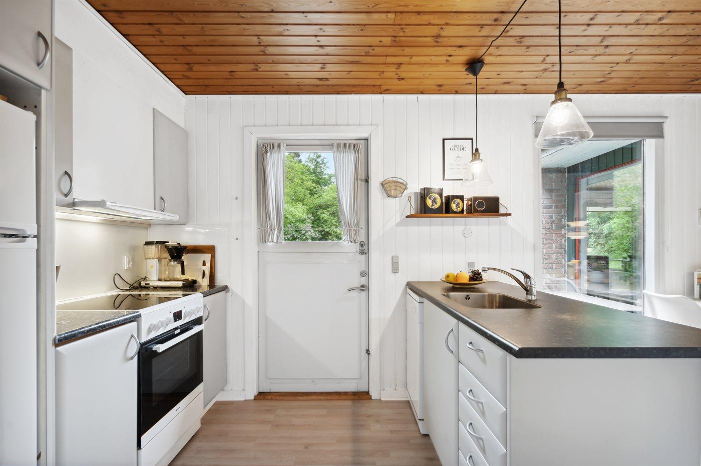 Køkkenet er udstyret med 1 køleskab. Der er 4 keramiske kogeplader, varmluftovn, mikrobølgeovn samt opvaskemaskine.