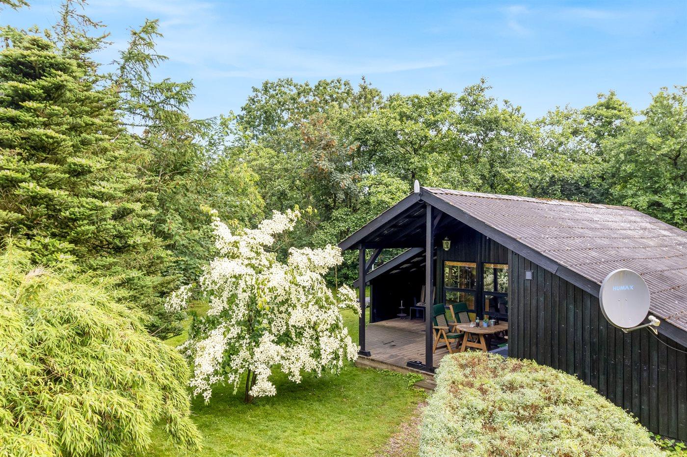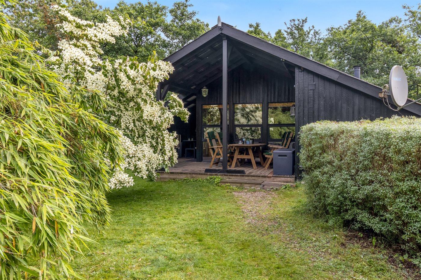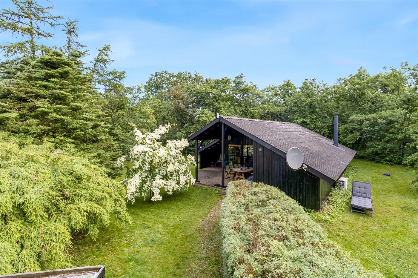 Hyggeligt sommerhus midt i skoven med indhegnet have og sauna for afslapning.