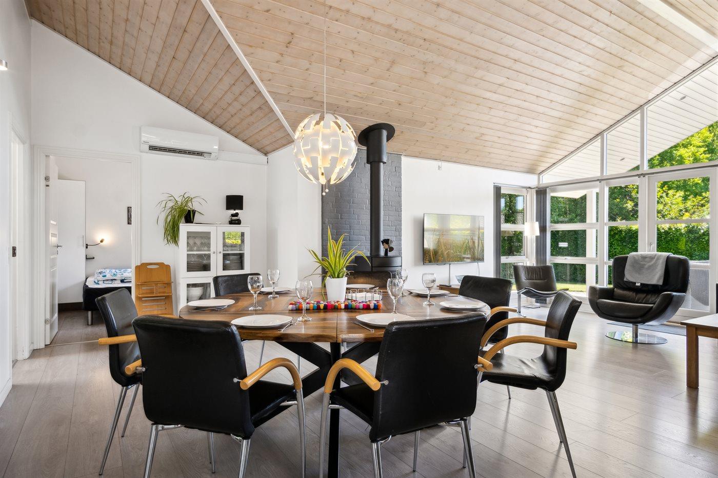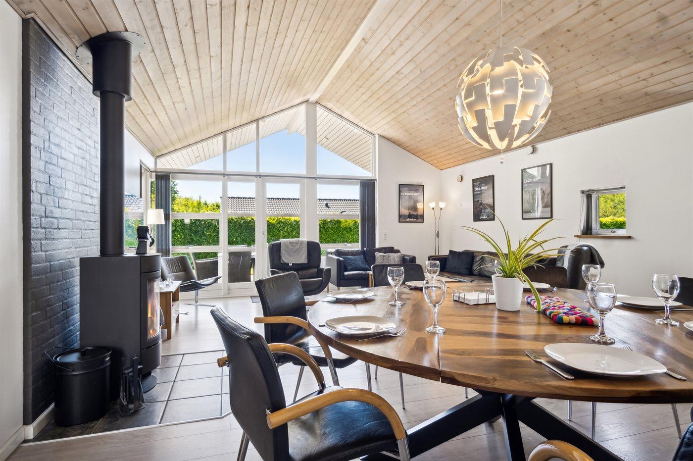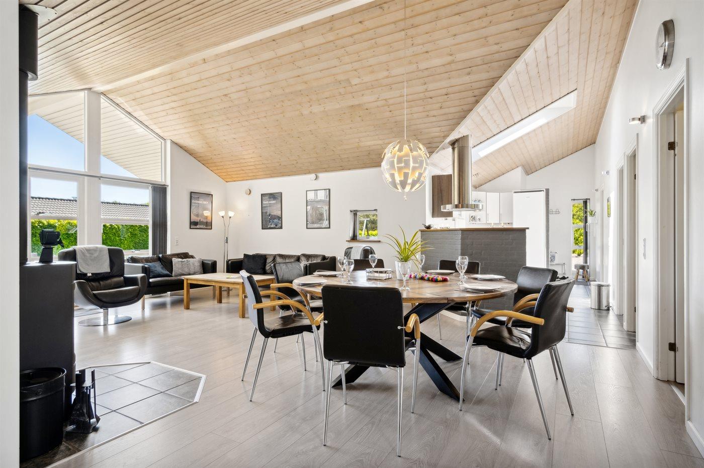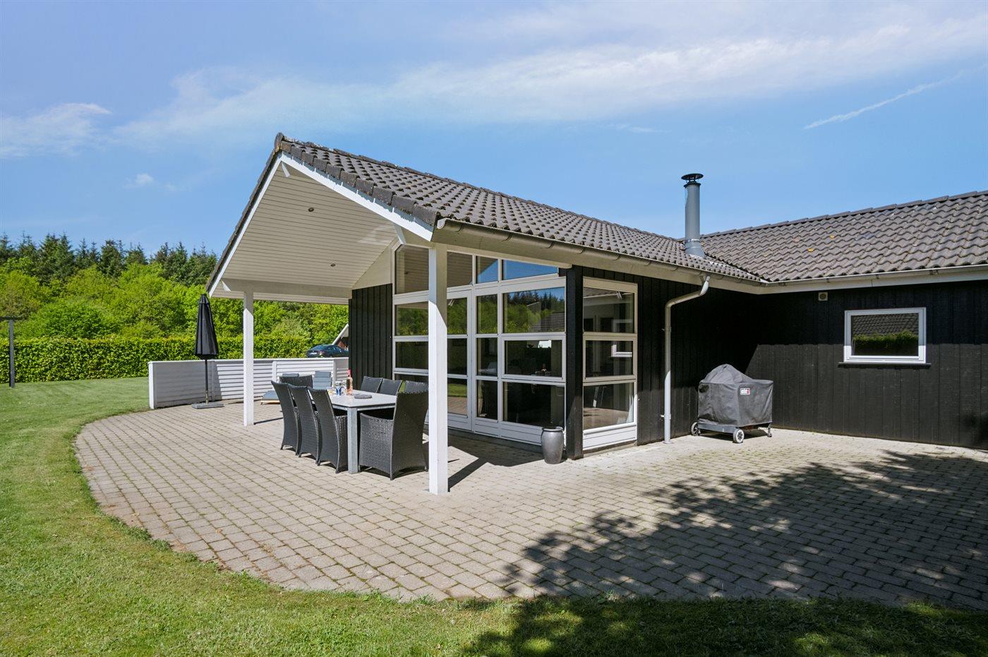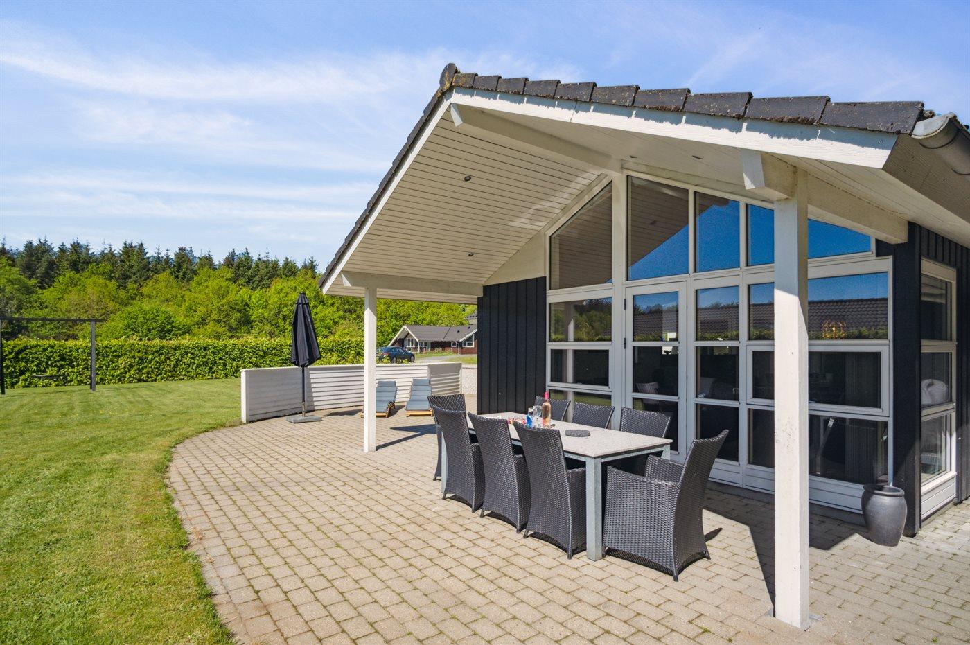 Flot, stort sommerhus meget tæt på svømmehallen, fiskesøen og legepladsen. Her er god plads til hele familien - også udenfor på den store terrasse.