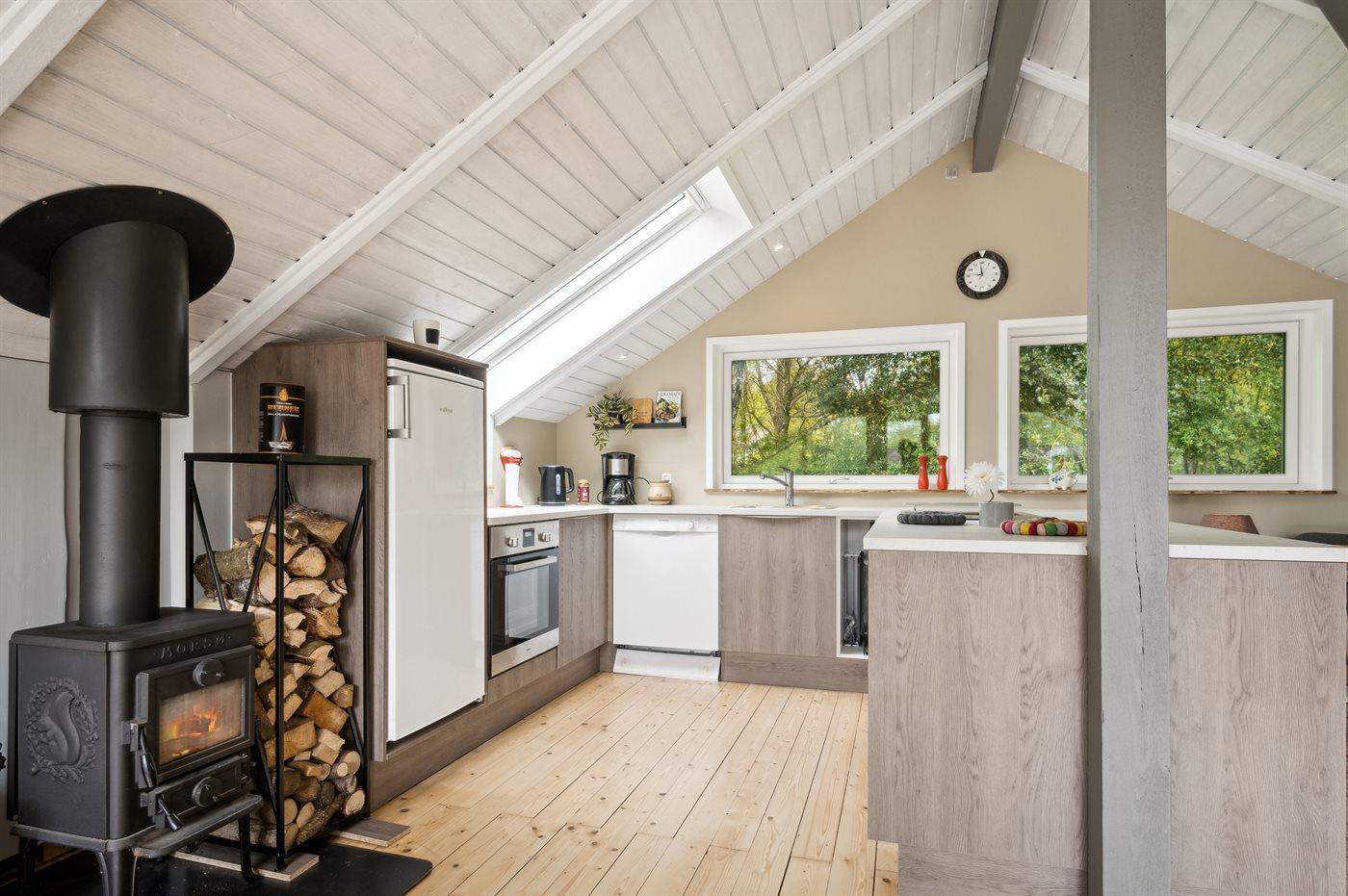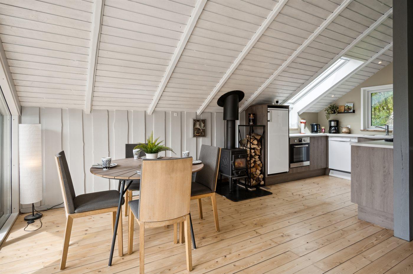 Køkkenet er udstyret med 1 køleskab. Der er 4 keramiske kogeplader, varmluftovn, mikrobølgeovn samt opvaskemaskine.