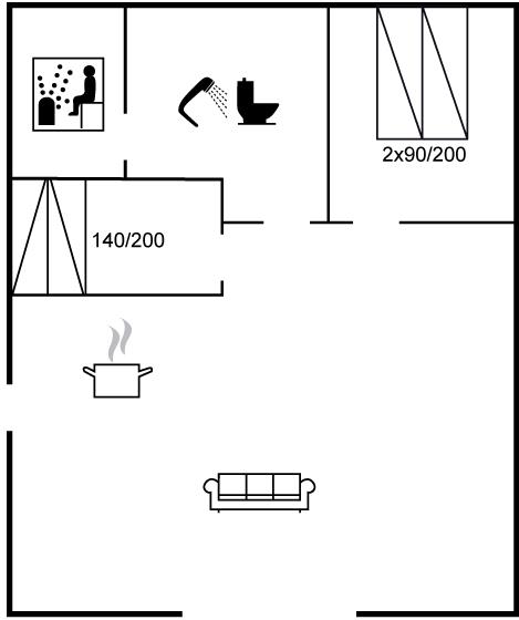 Der er i alt 2 soveværelser. Sovepladserne fordeler sig på: 4 sovepladser i dobbeltsenge. 2 sovepladser i enkeltsenge. 2 af disse sovepladser befinder sig på husets hems. Derudover er der 1 stk. barneseng.