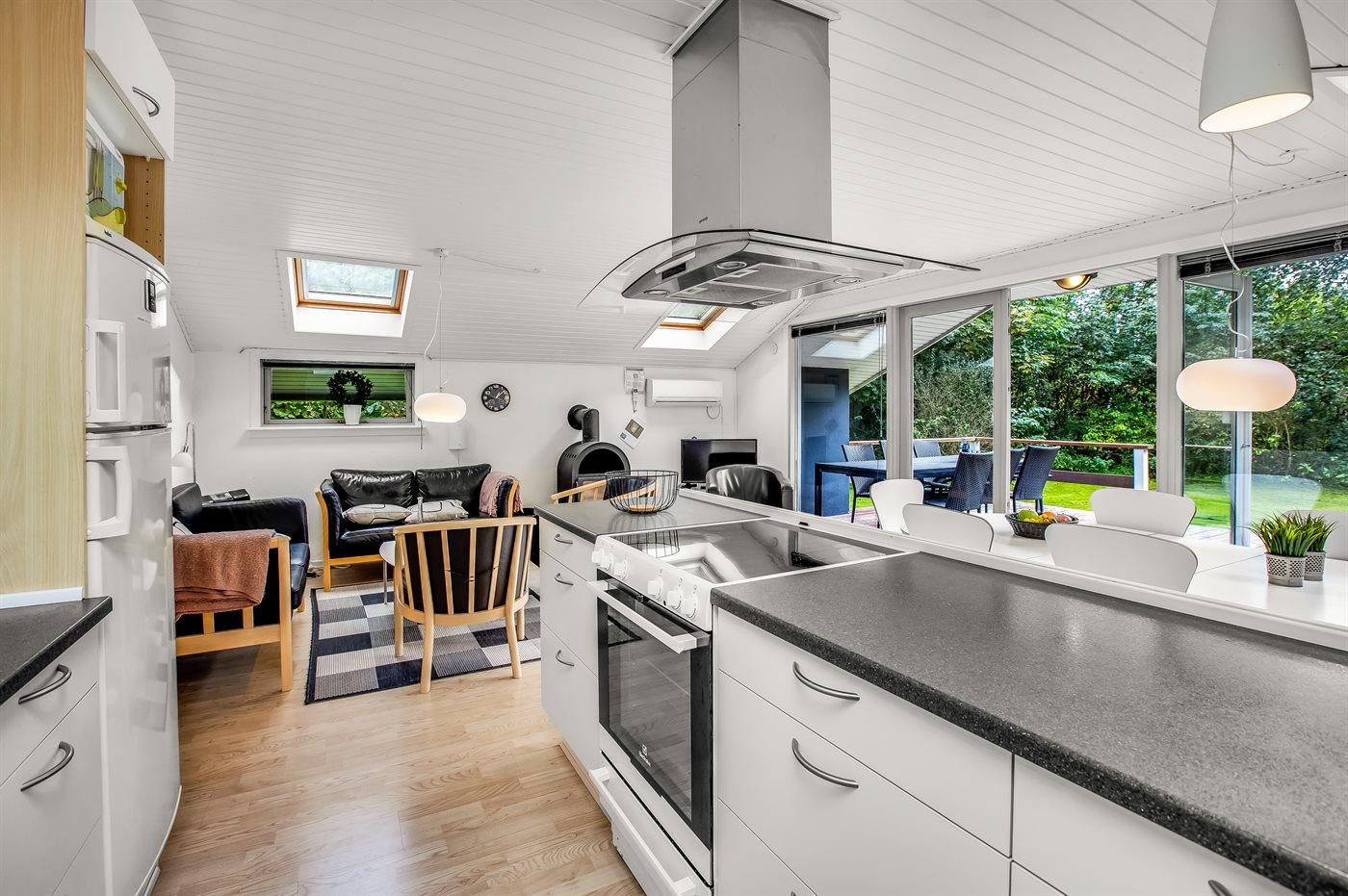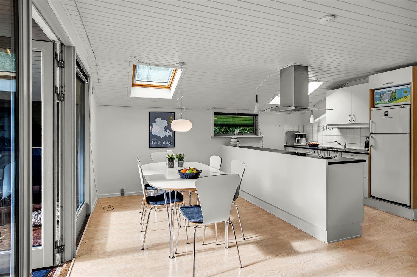 Køkkenet er udstyret med 1 køleskab. Der er 4 keramiske kogeplader, varmluftovn, mikrobølgeovn samt opvaskemaskine.