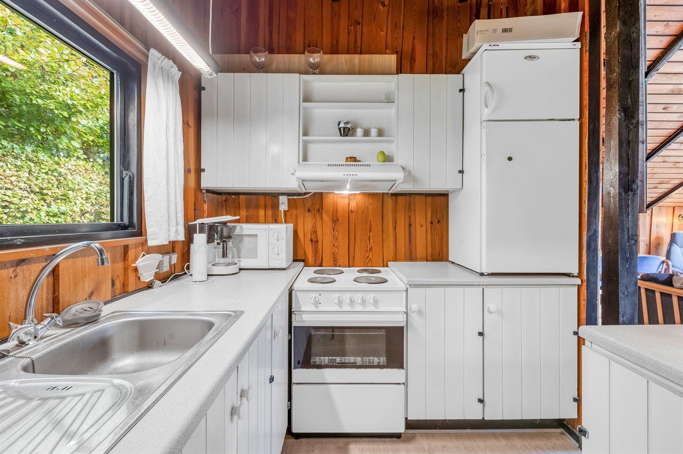 Køkkenet er udstyret med 1 køleskab. Der er 4 elkogeplader, varmluftovn, mikrobølgeovn samt opvaskemaskine.