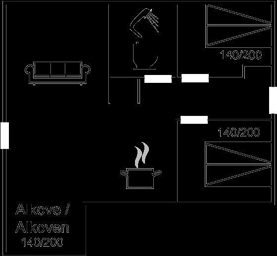 Der er i alt 2 soveværelser. Sovepladserne fordeler sig på: 4 sovepladser i dobbeltsenge. 2 sovepladser i alkove. 2 af disse sovepladser befinder sig i stuen.