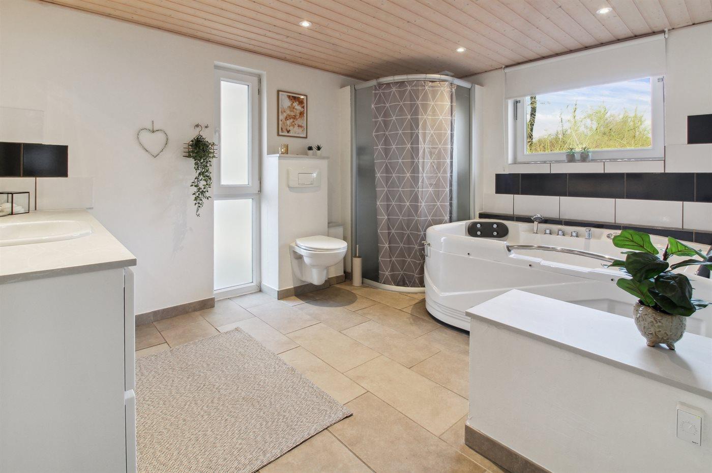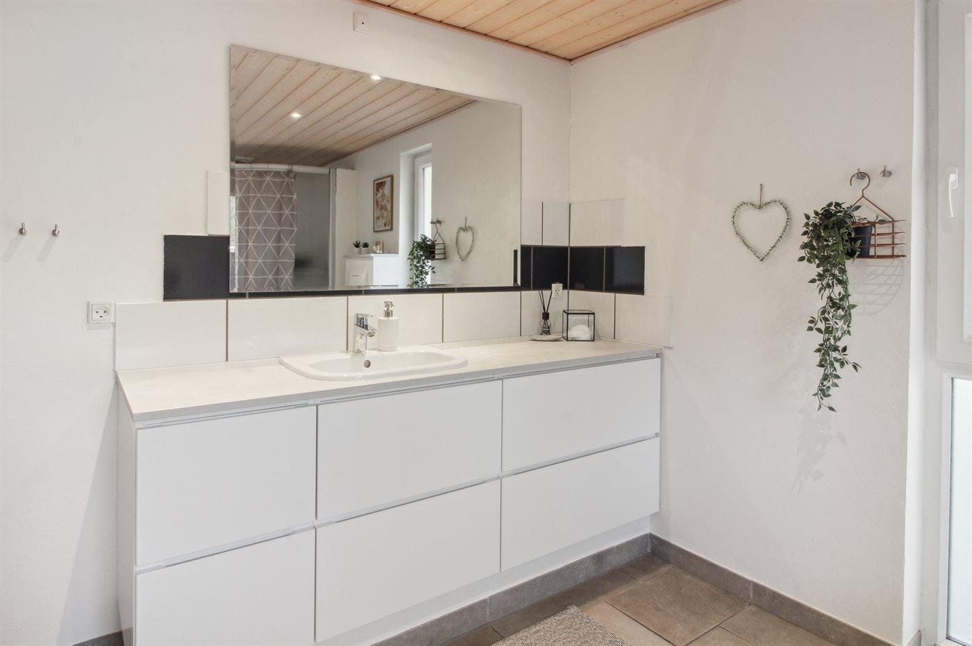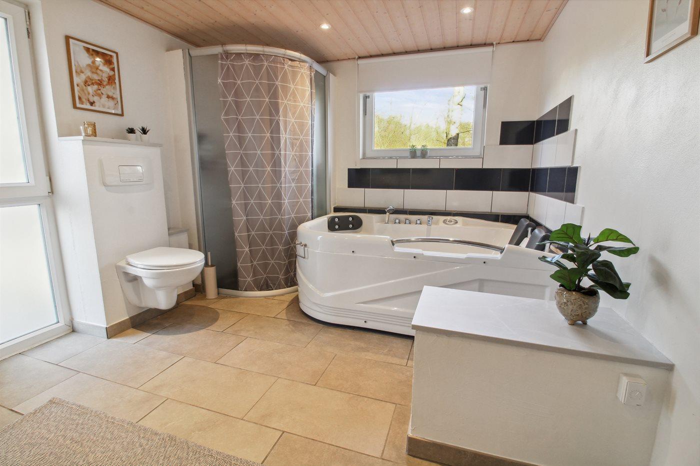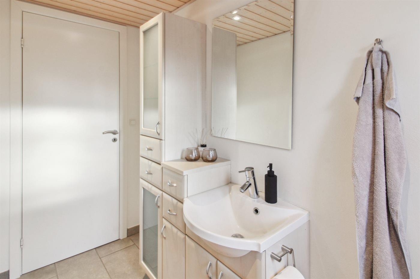 Der er 1 badeværelse med bruseniche og 2 toiletter, heraf 1 gæstetoilet. Der er gulvvarme på 1 badeværelse.