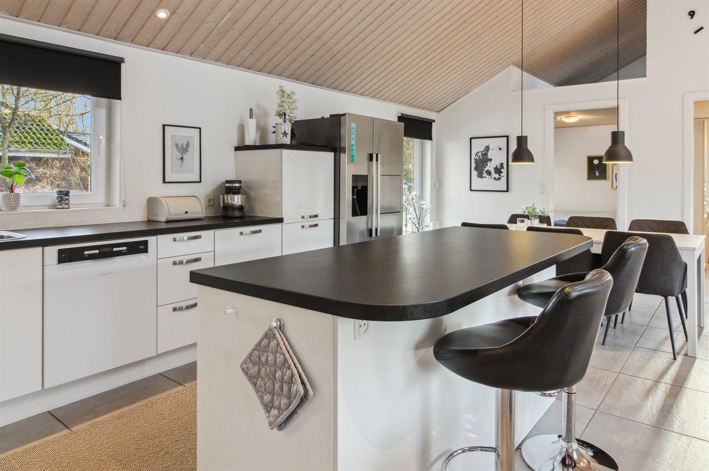 Feriehuset har et stort lyst køkken/alrum med lofter til kip og direkte udgang til den store, delvist overdækkede terrasse.