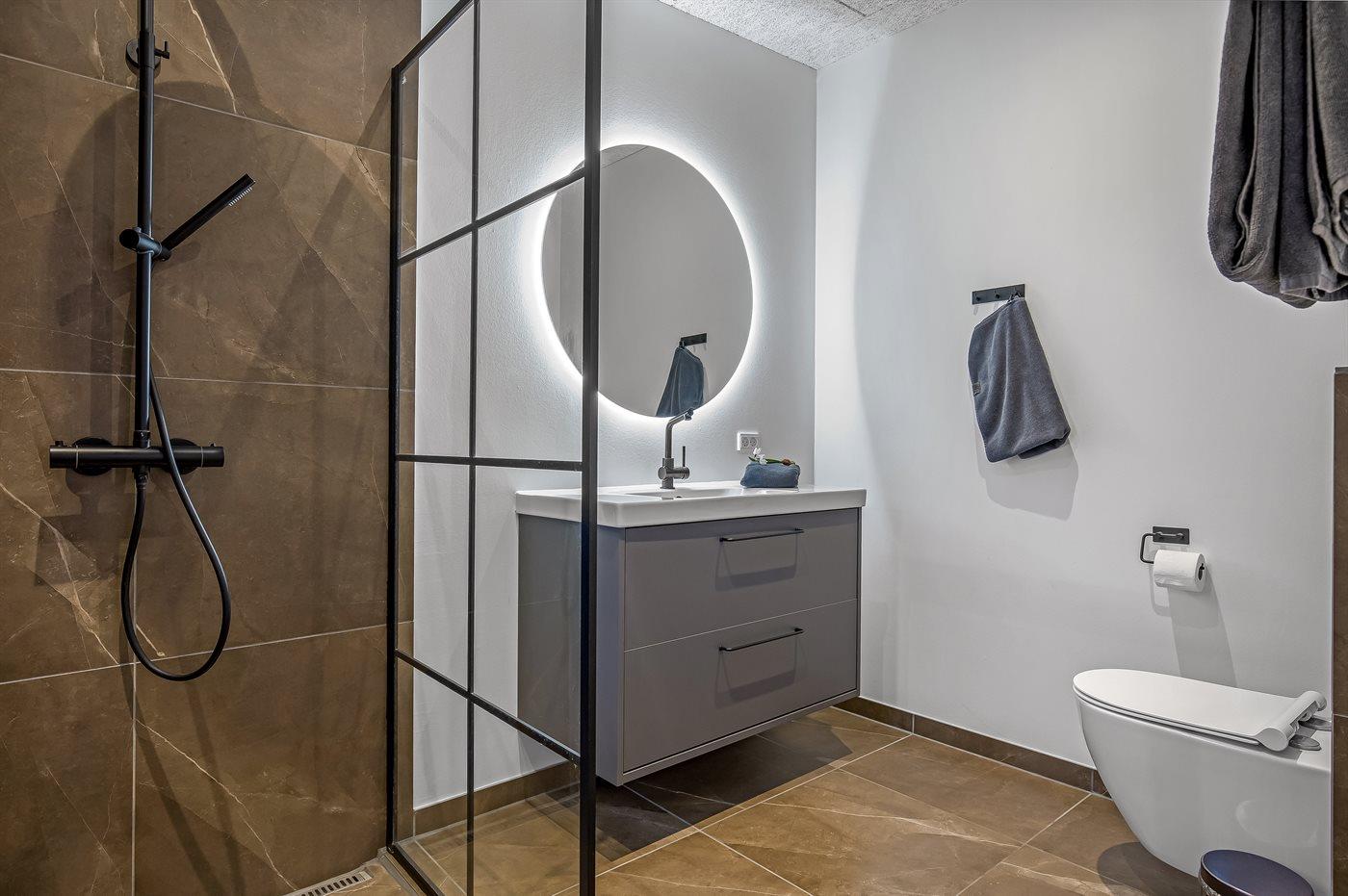 Der er 2 badeværelser med bruseniche og 2 toiletter. Der er gulvvarme på 2 badeværelser.