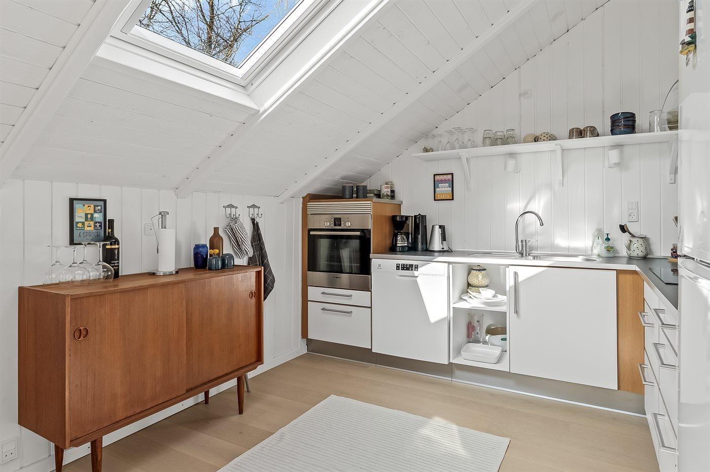 Køkkenet er udstyret med 1 køleskab. Der er 4 keramiske kogeplader, varmluftovn, mikrobølgeovn samt opvaskemaskine.