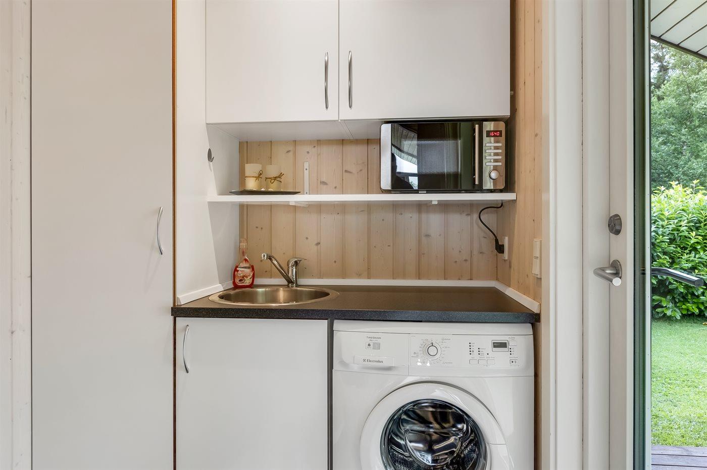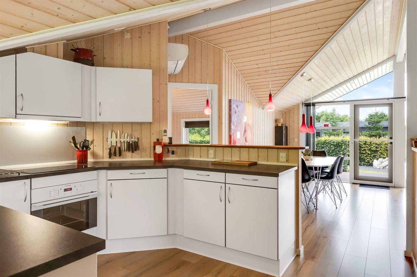 Køkkenet er udstyret med 1 køleskab. Der er 4 keramiske kogeplader, varmluftovn, mikrobølgeovn samt opvaskemaskine.