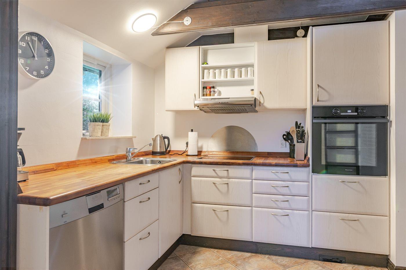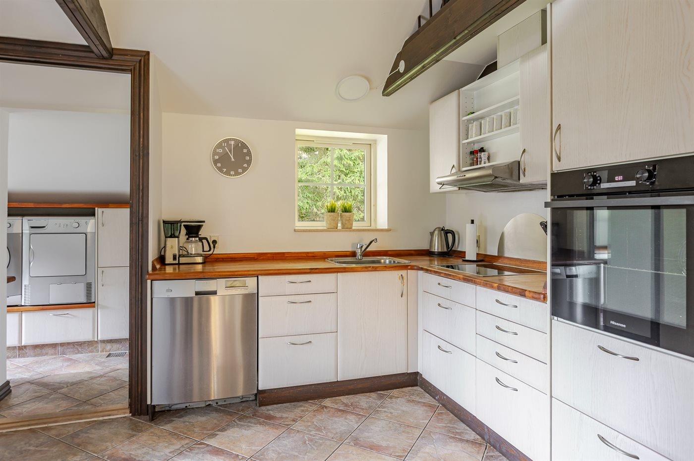 Køkkenet er udstyret med 1 køleskab. Der er 4 keramiske kogeplader, varmluftovn, mikrobølgeovn samt opvaskemaskine.