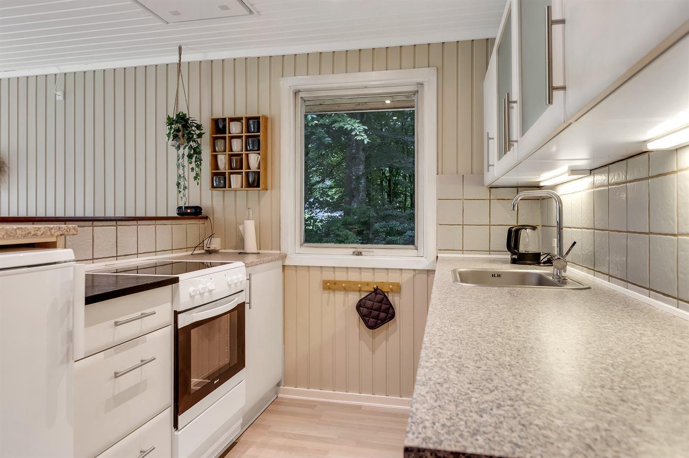 Køkkenet er udstyret med 1 køleskab. Der er 4 keramiske kogeplader, varmluftovn, mikrobølgeovn samt opvaskemaskine.