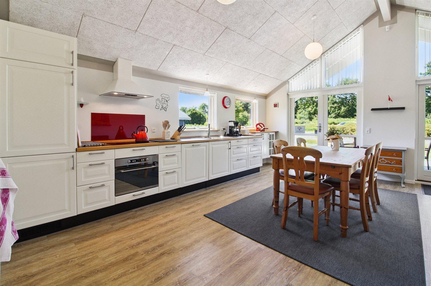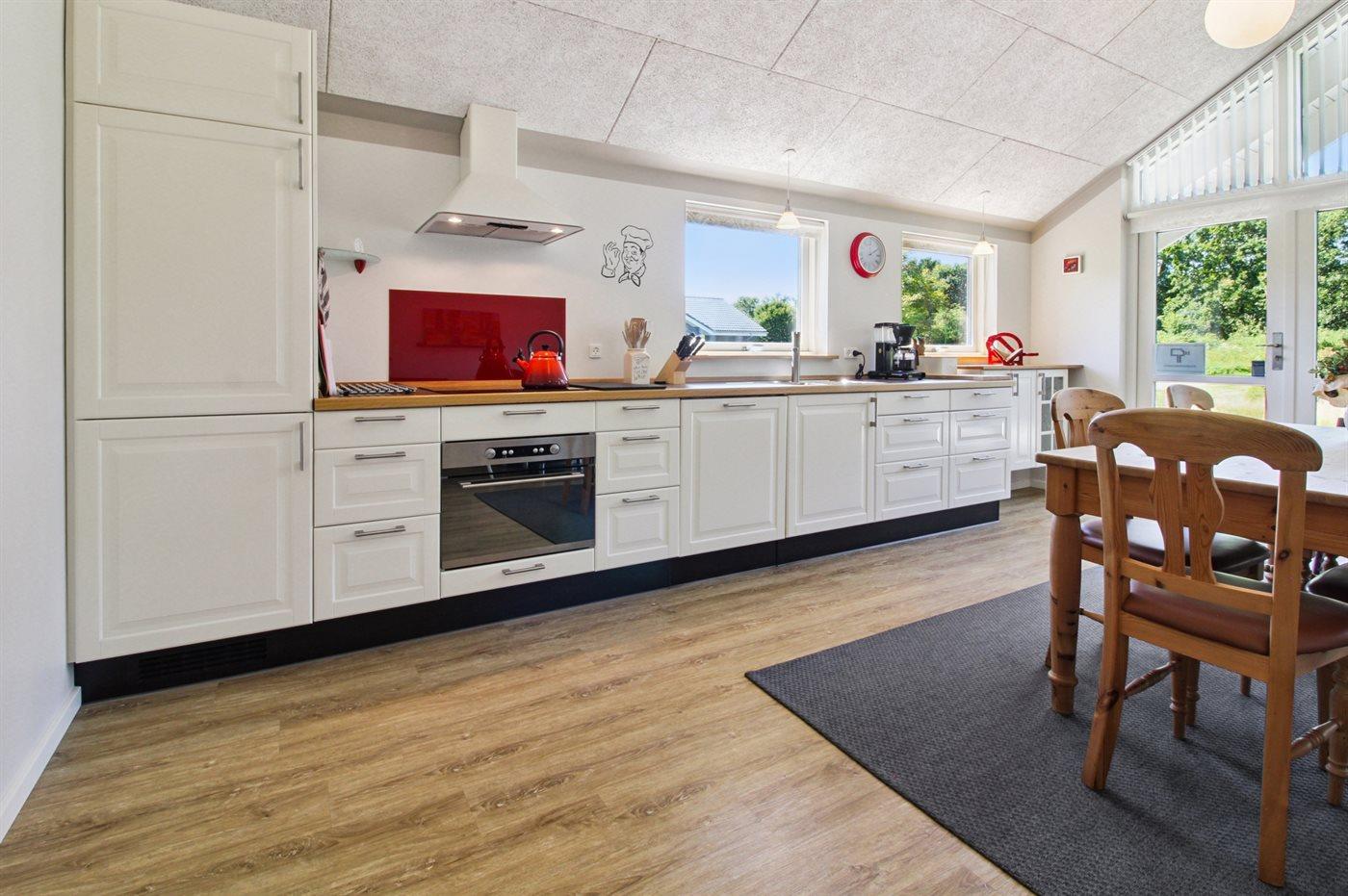 Køkkenet er udstyret med 1 køleskab. Der er 4 induktionskogeplader, varmluftovn, mikrobølgeovn samt opvaskemaskine.