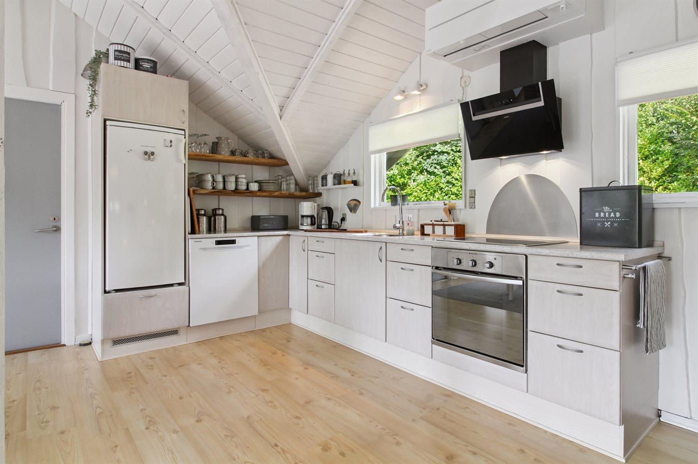 Køkkenet er udstyret med 1 køleskab. Der er 4 keramiske kogeplader, varmluftovn, mikrobølgeovn samt opvaskemaskine.