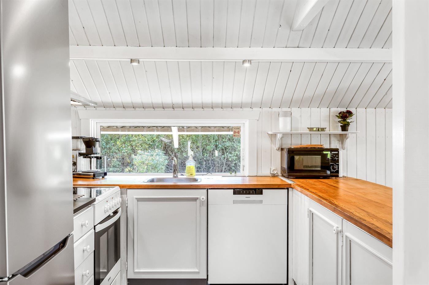 Køkkenet er udstyret med 1 køleskab. Der er 4 keramiske kogeplader, varmluftovn, mikrobølgeovn samt opvaskemaskine.