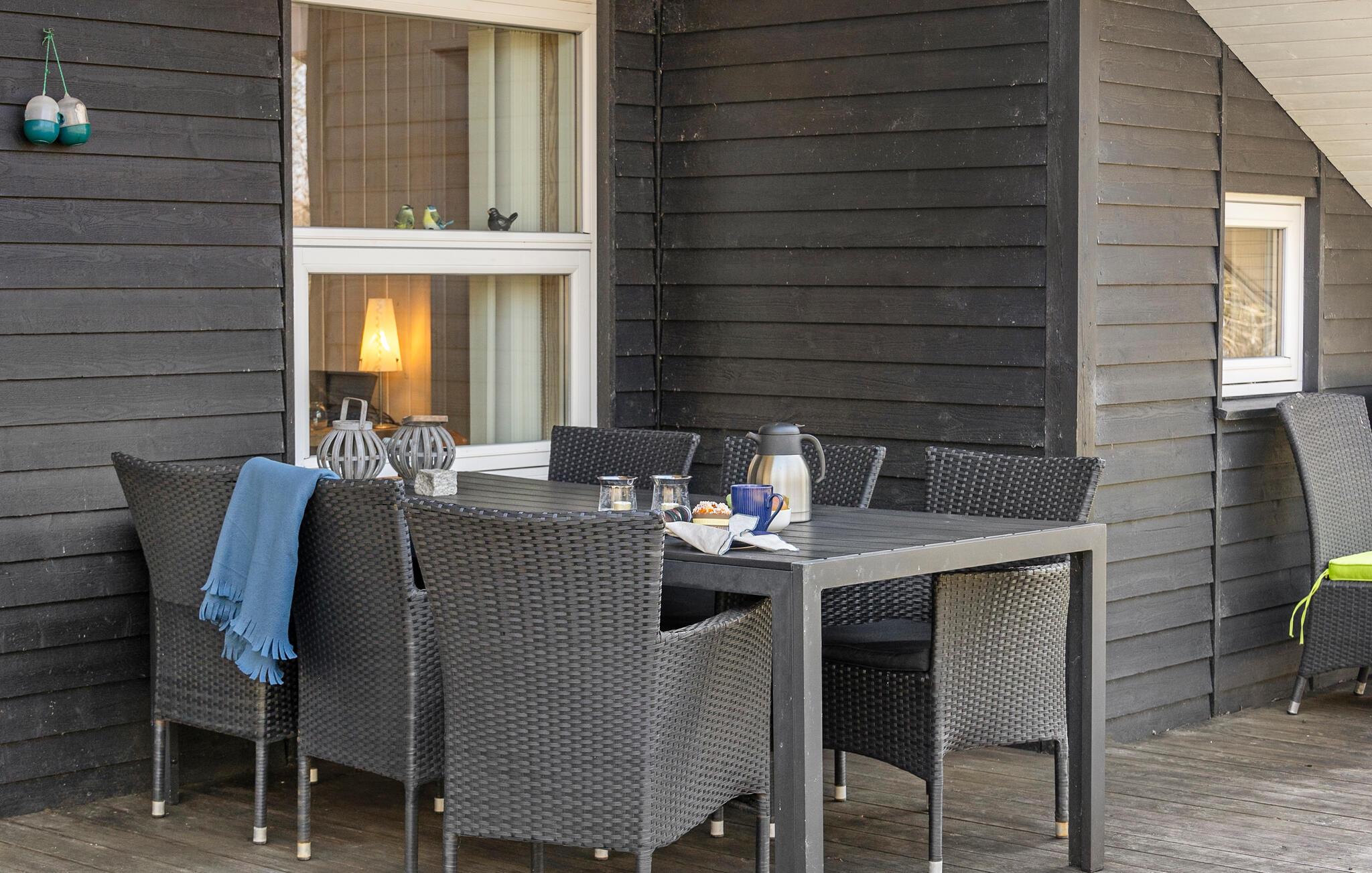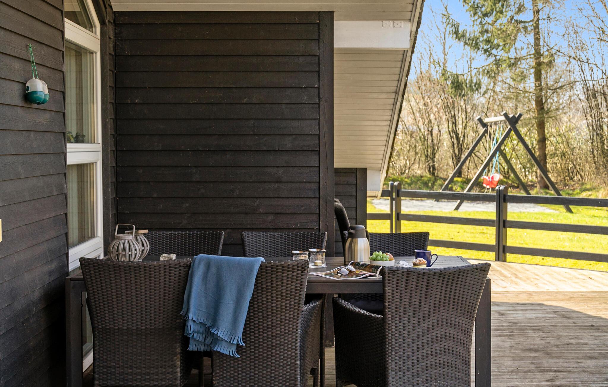 Udenfor er der en stor terrasse med havemøbler, hvor I kan nyde måltiderne i den friske luft eller bare læne jer tilbage. Mens I nyder dagen i solen, kan børnene boltre sig ??på den store græsplæne, gynge eller udforske de rolige omgivelser. Husets beliggenhed giver de bedste forudsætninger for vandre- eller cykelture gennem det blide, grønne sønderjyske landskab.