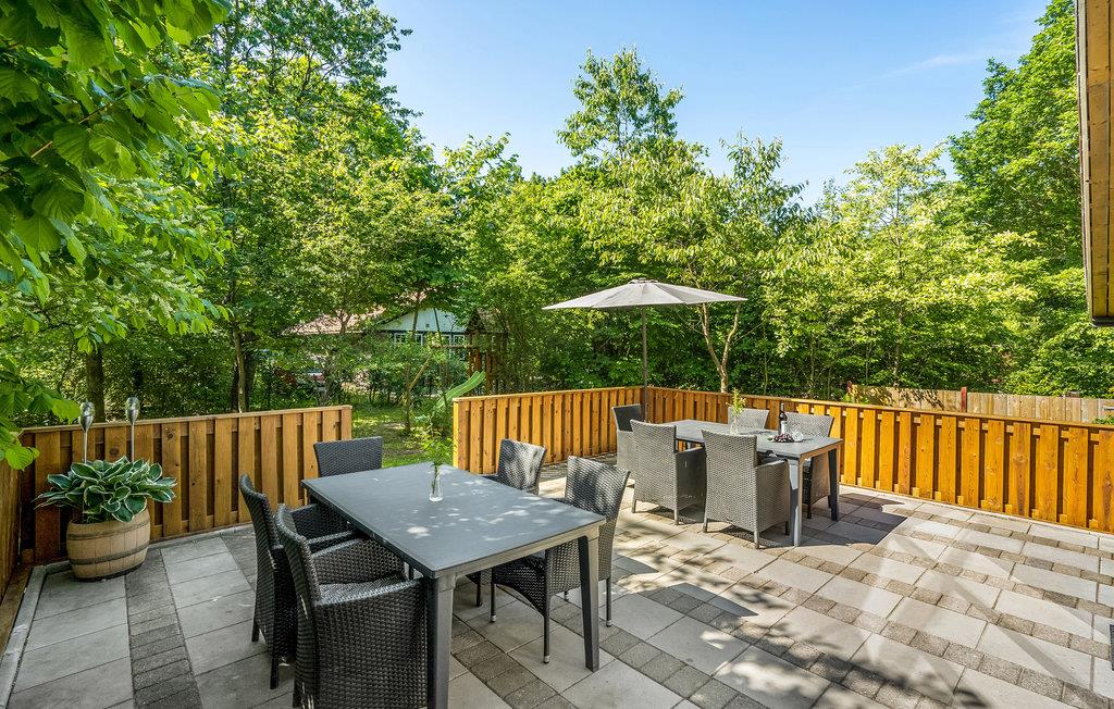 Fra stuen er der adgang til en stor terrasse med udsigt over haven og skoven. Her kan I sidde og slappe af eller nyde lækker mad fra grillen.