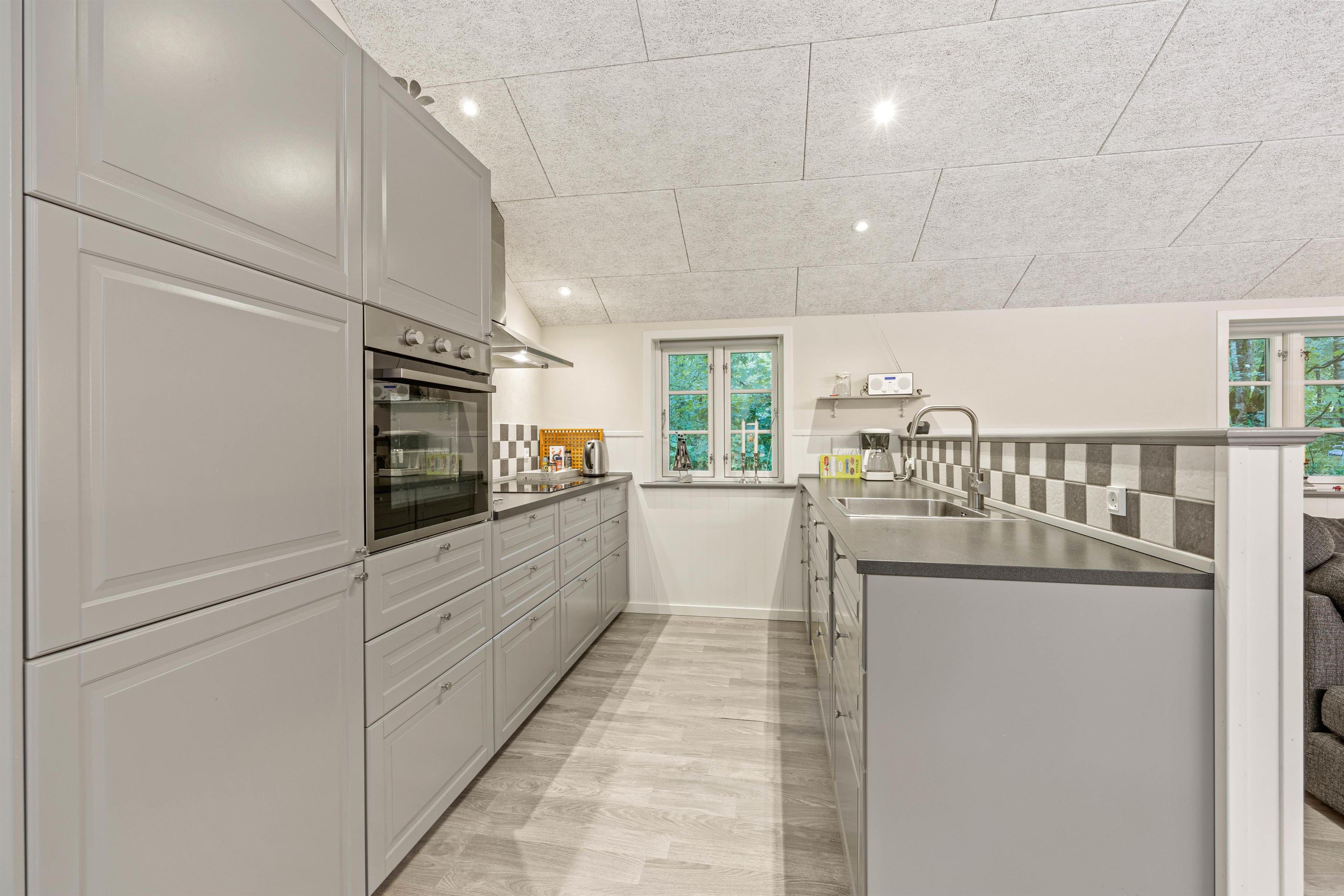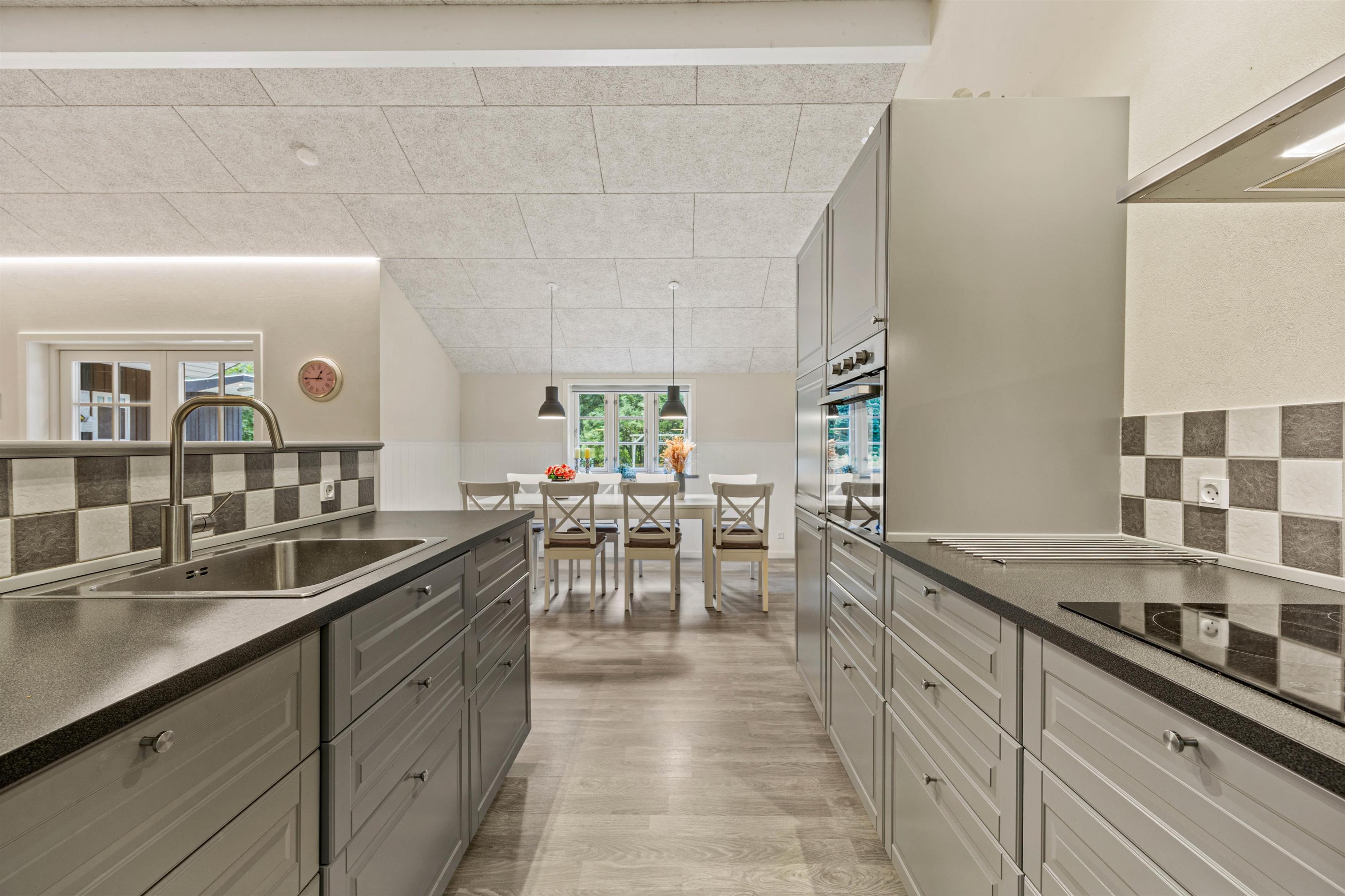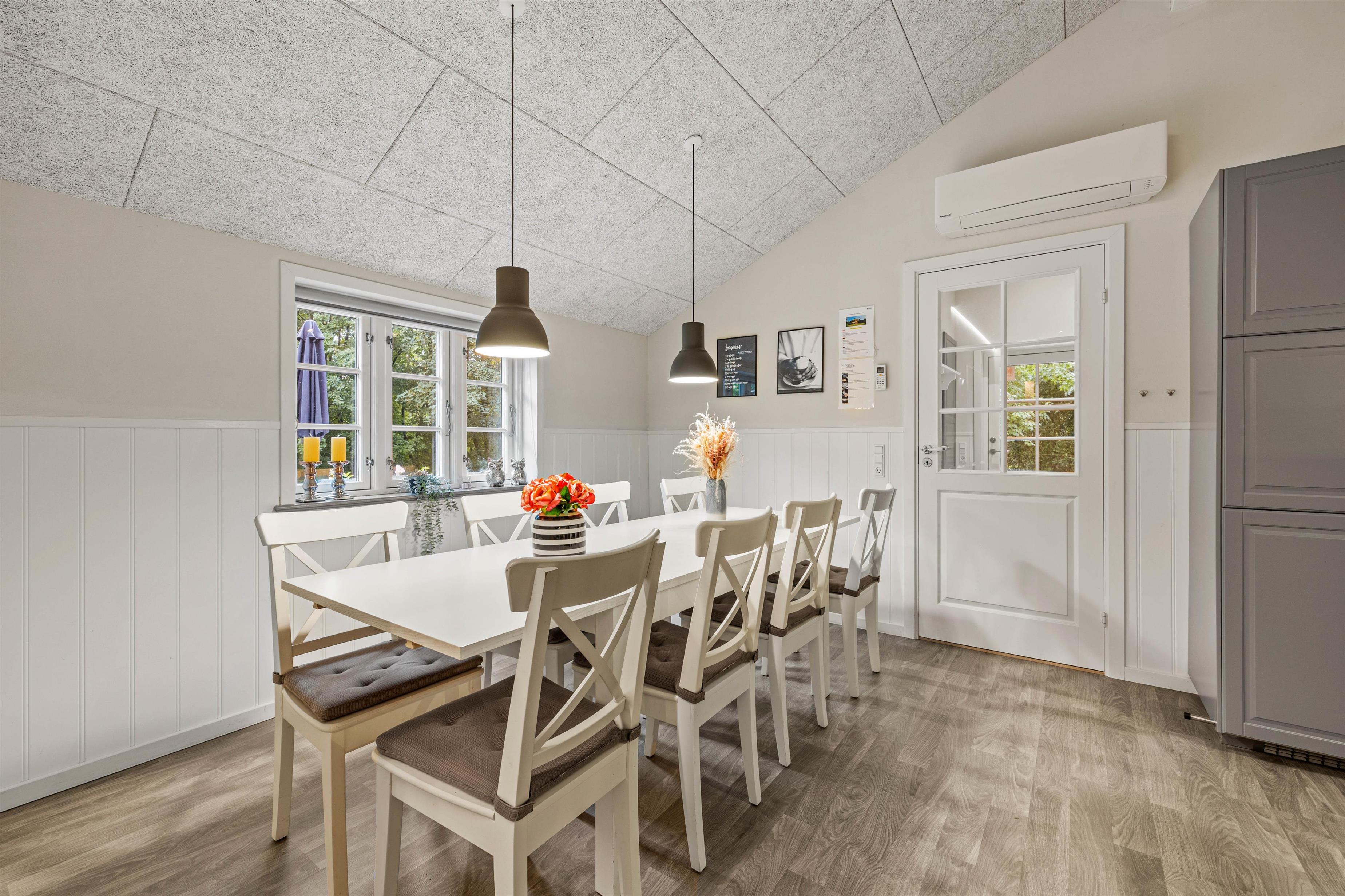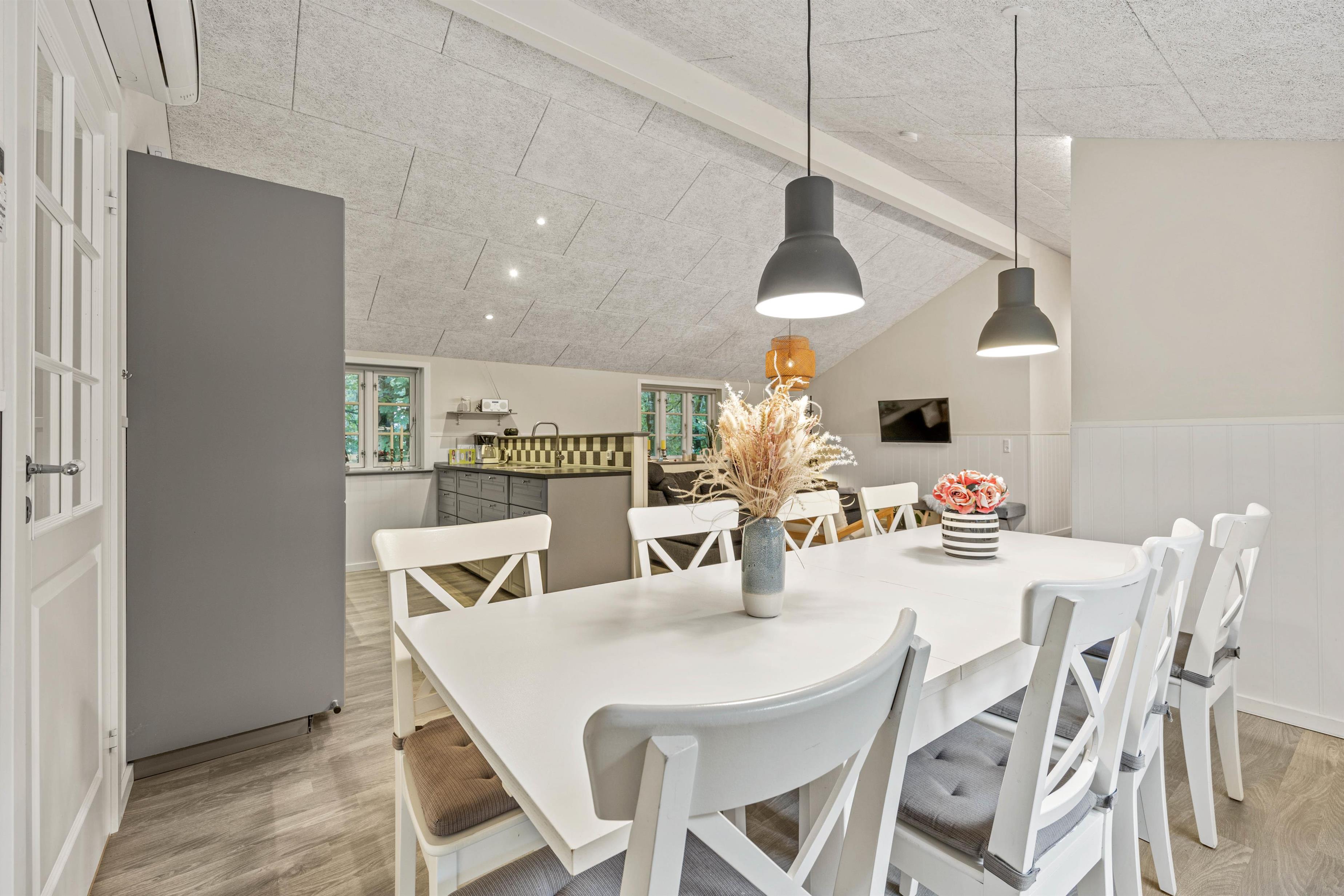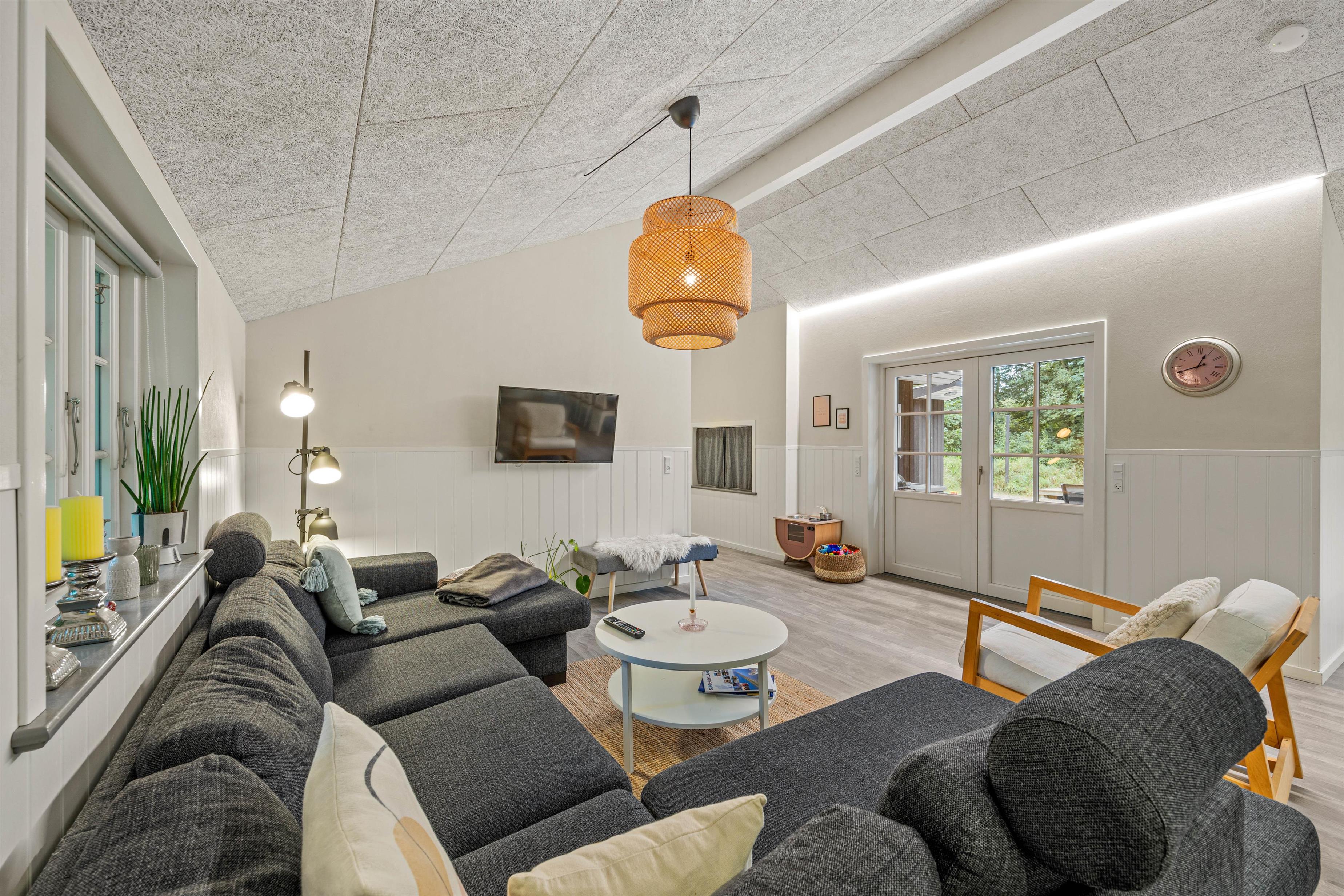 Sommerhusets hjerterum er det lyse, moderne og indbydende alrum, hvor stue, spiseplads og køkken ligger samlet. Her kan hele familien nyde hinandens selskab – Også når der skal laves mad i det veludstyrede køkken. Til aften kan I samles i sofaen til en god film. Der er både danske tv-kanaler og Chromecast i sommerhuset. I kan med fordel bruge den energibesparende varmepumpe i rummet til at holde en behagelig temperatur.