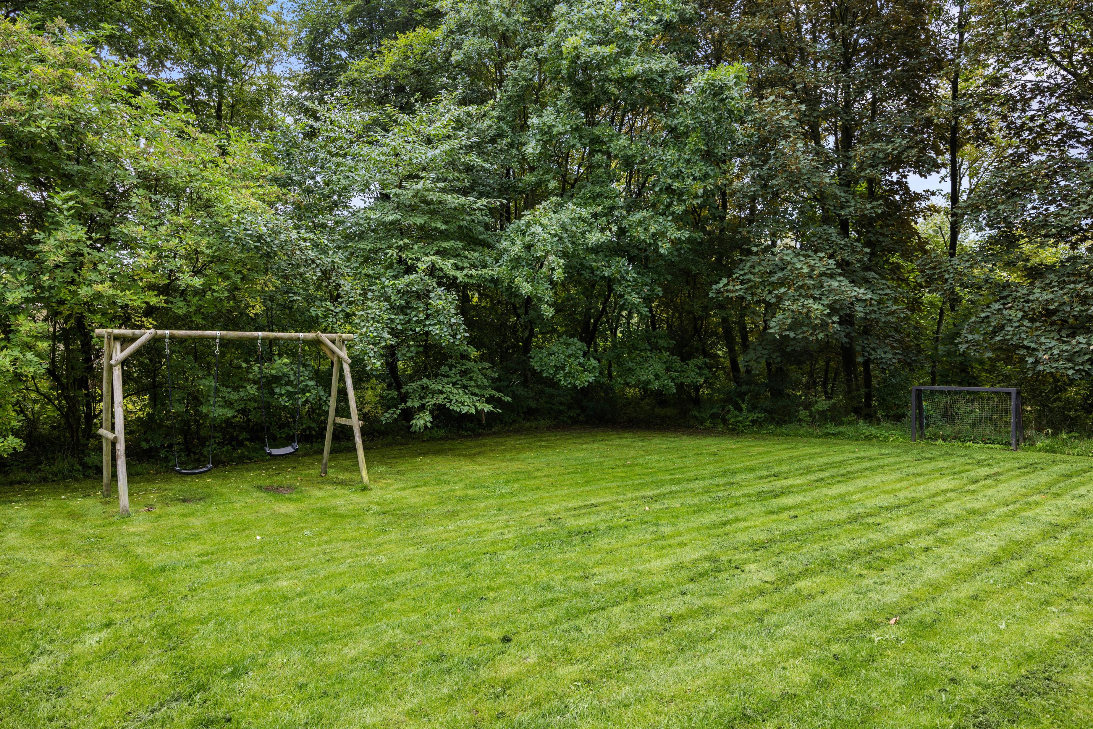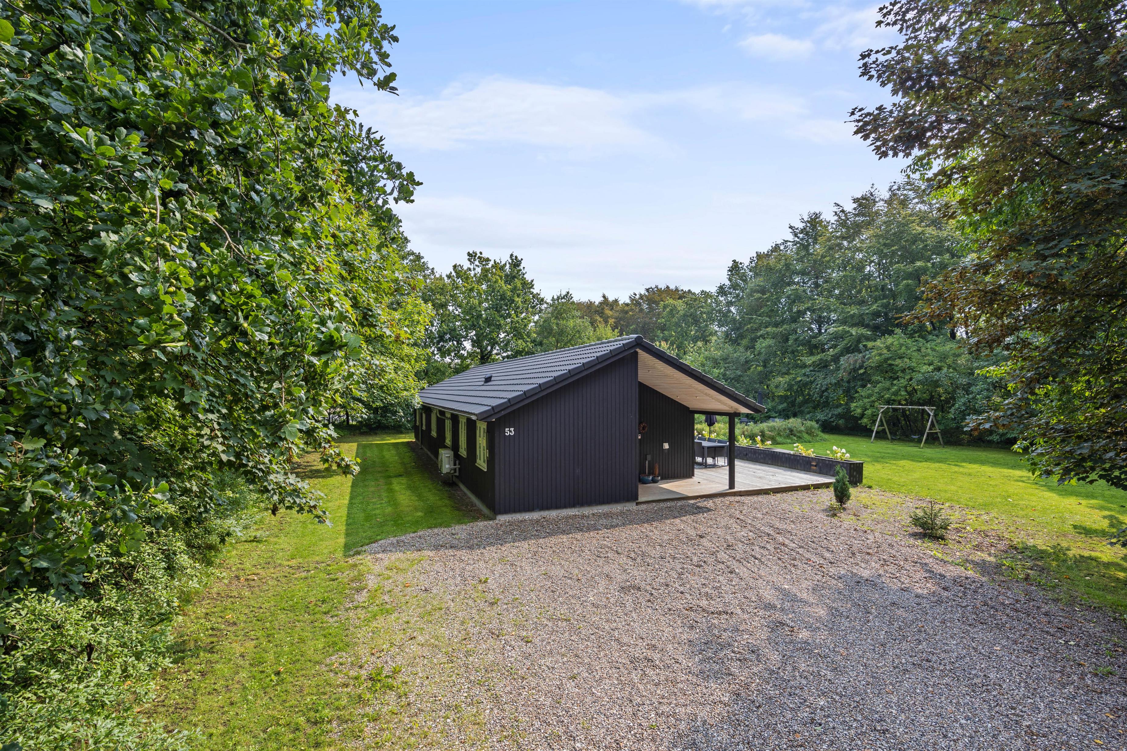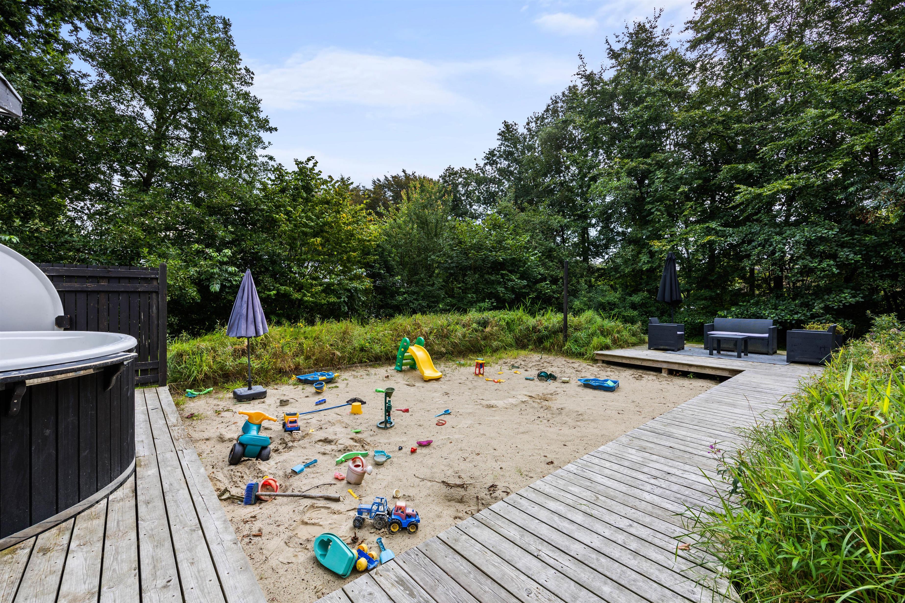 Det flotte sommerhus ligger på en skøn plænegrund, hvor der er god plads til sjov og leg for familiens yngste. Her er der et gyngestativ, og i forlængelse af terrassen er der en stor sandkasse, som helt sikkert vil blive et hit blandt de yngste i familien.