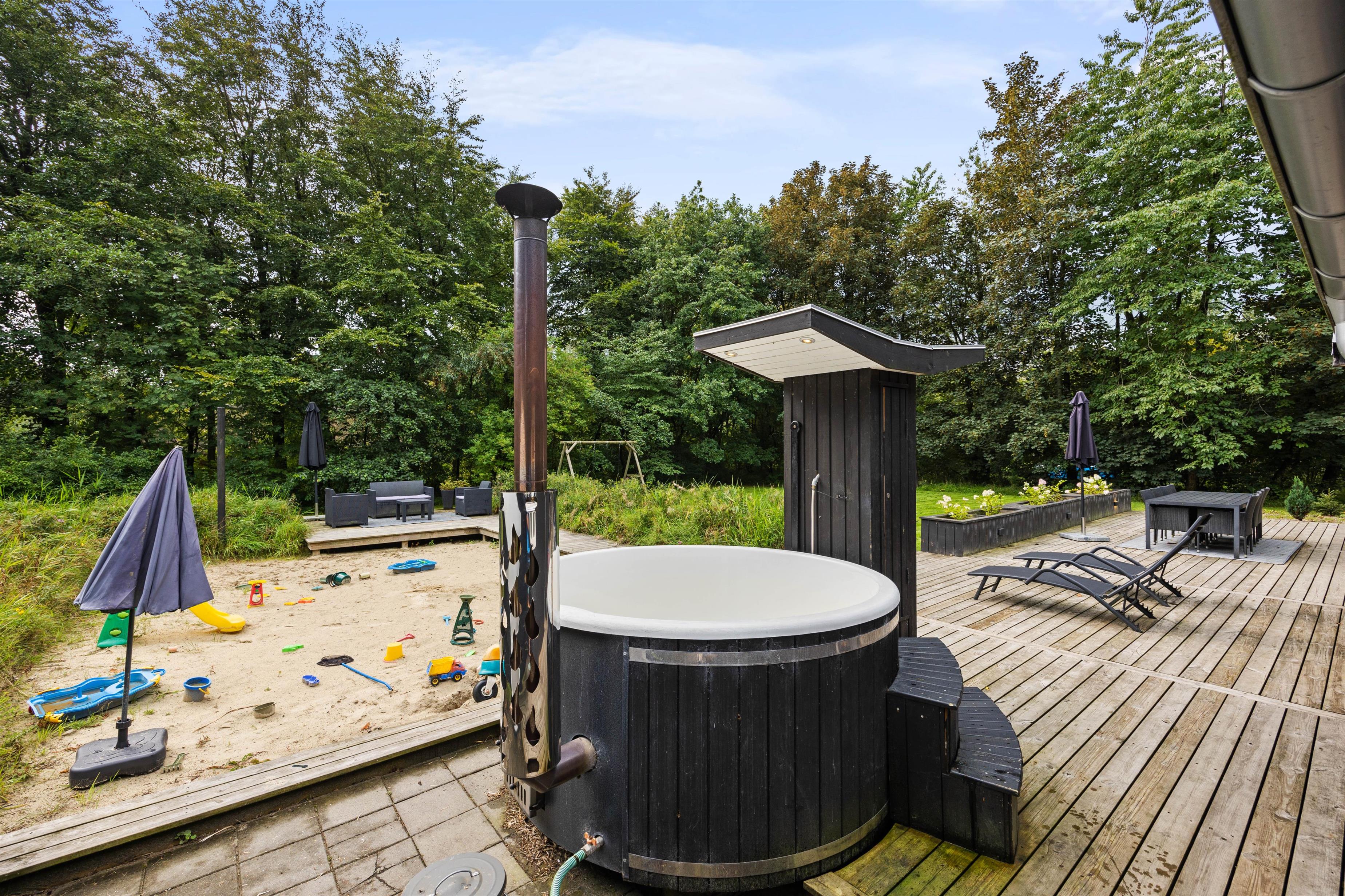 Terrassen indbyder til hyggelige stunder for hele familien med gode havemøbler, liggestole og grill. Efter en oplevelsesrig feriedag kan I slutte af med en tur i det varme vildmarksbad, efter I har skyllet jer under den udendørs bruser, der kan benyttes fra april til november.