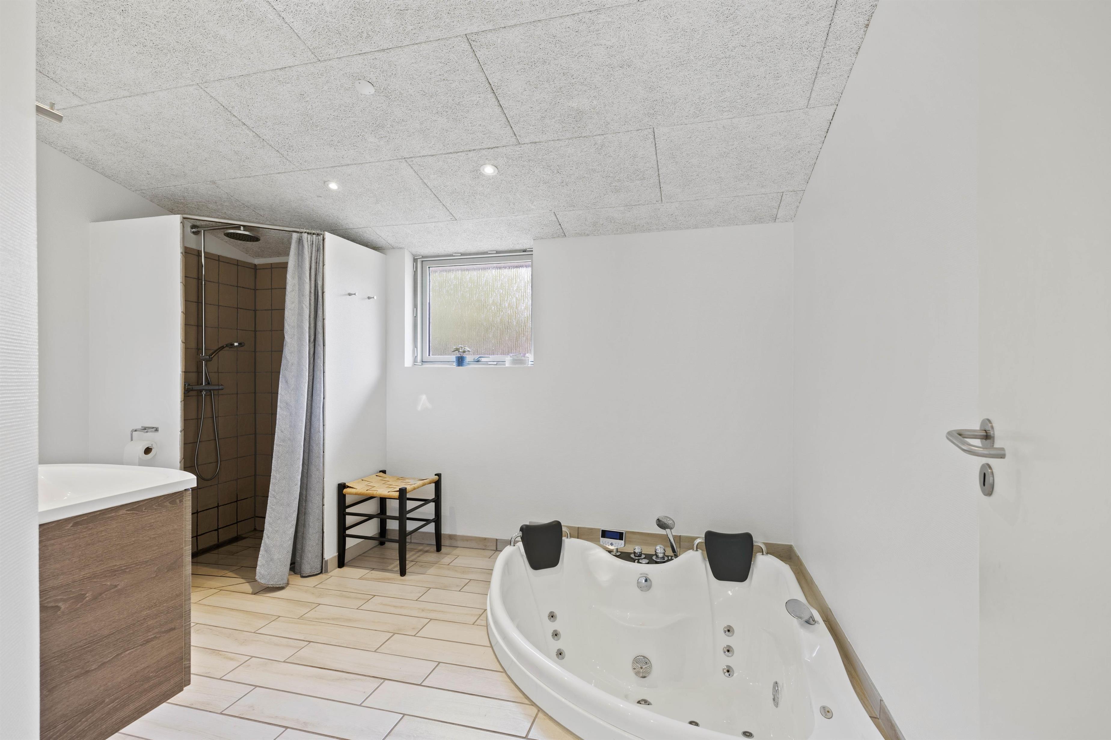 Med indendørs faciliteter som gulvvarme i badeværelset og en luft-til-vand varmepumpe, kan I altid finde jer til rette uanset årstiden. Badeværelset byder også på en luksuriøs tømmespa, hvor I kan slappe af og nyde roen. Desuden finder I et gæstetoilet, der sikrer ekstra bekvemmelighed under jeres ophold.