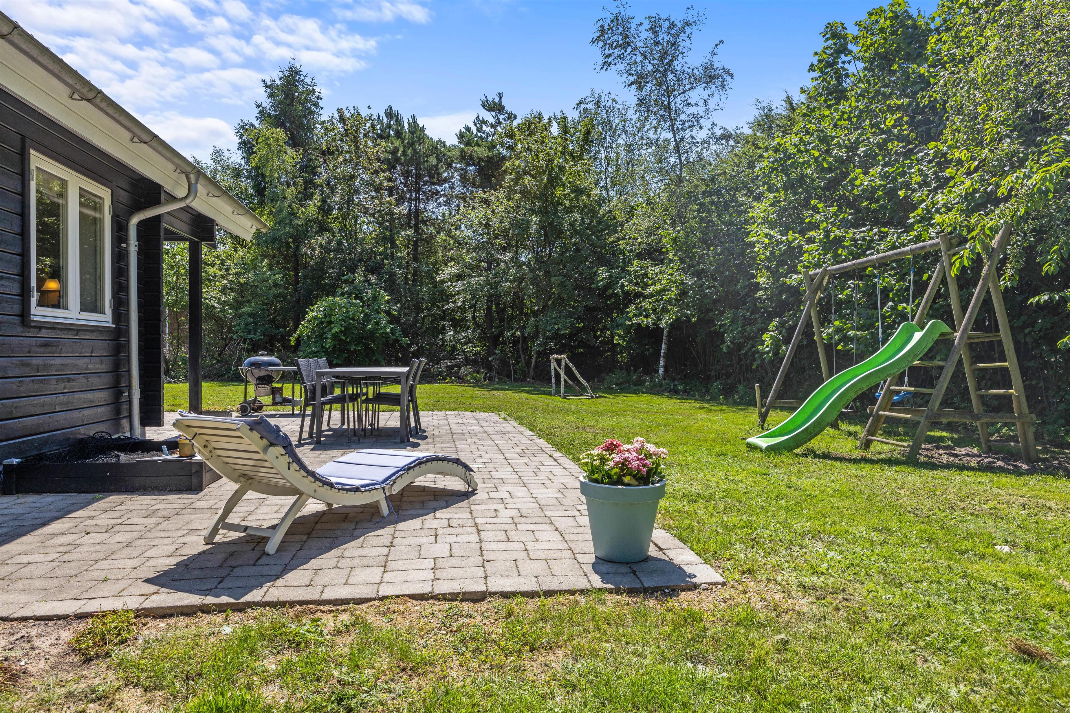 Fra stuen har i udgang til den fine terrasse og have. Her finder I mange hyggelige spots, hvor I kan slå jer ned og nyde morgenkaffen under halvtaget, en god bog eller de lune aftentimer med blik over den fredelige have. På græsplænen kan børnene spille fodbold, samtidig med hunden kan boltre sig løs på den indhegnede grund. Til de yngste venter her sandkasse og rutsjebane, som de helt sikkert vil kunne få glæde af.