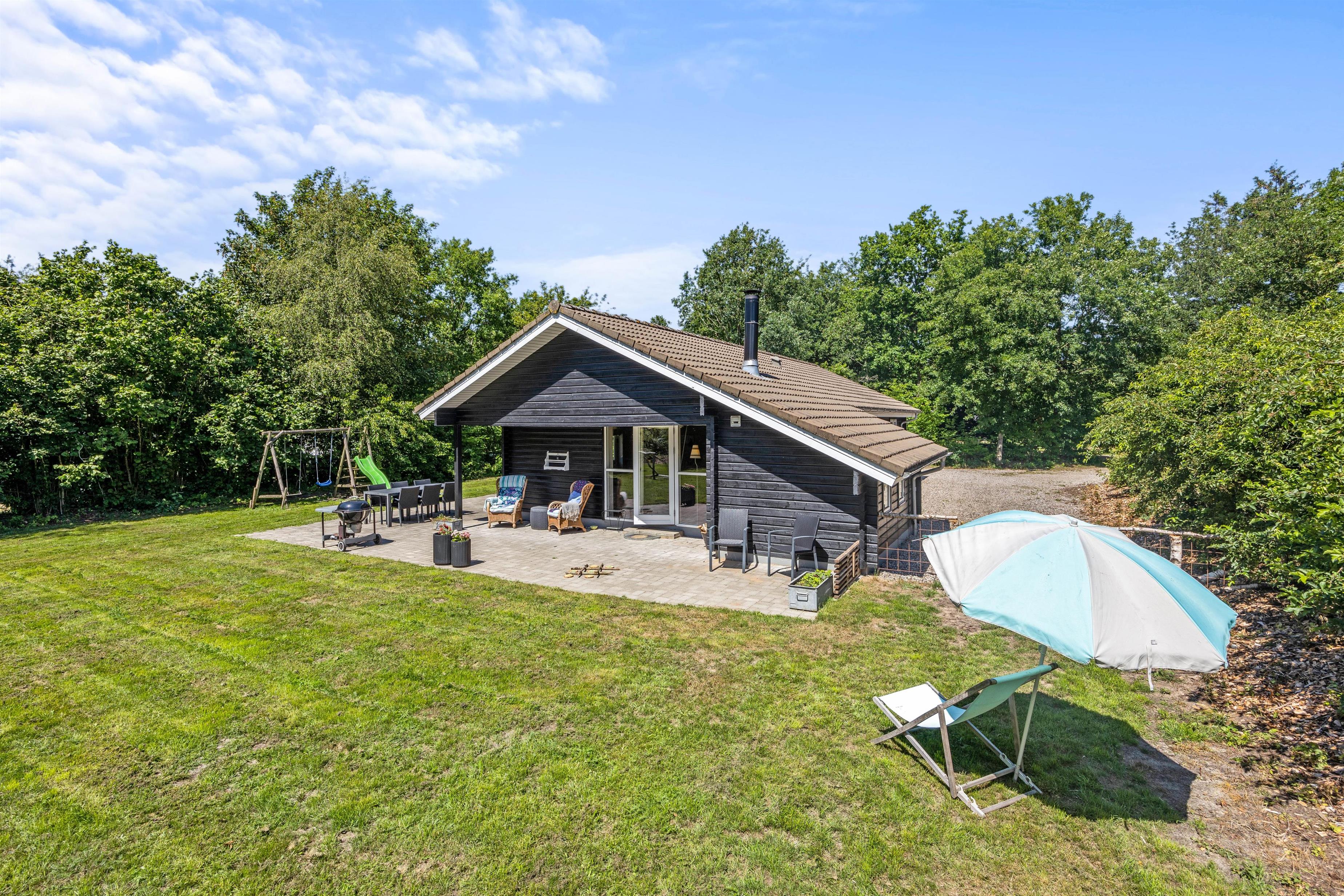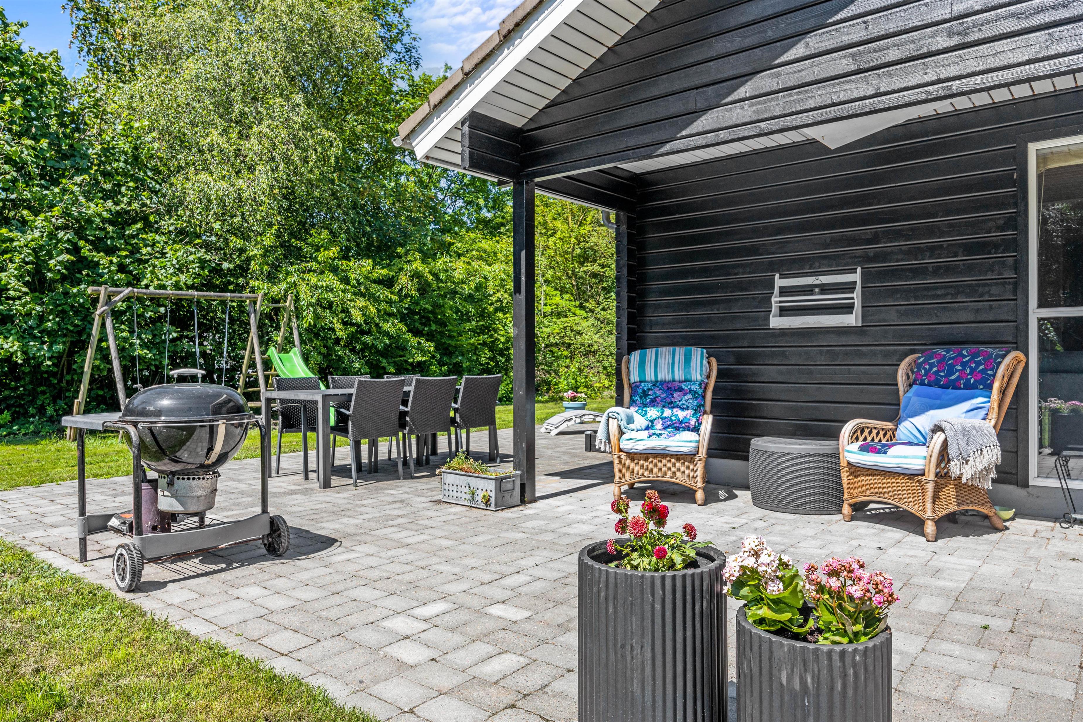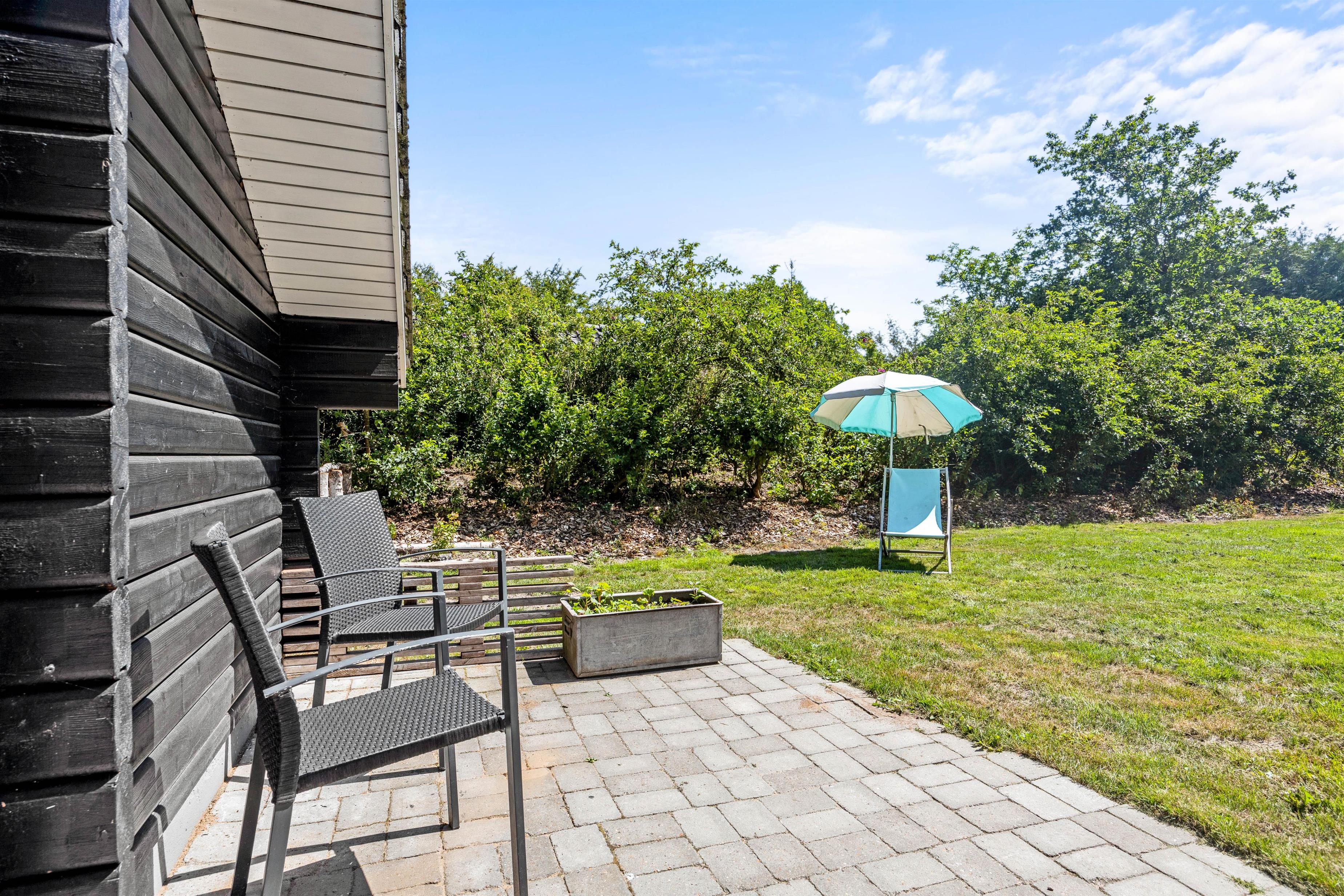 Om aftenen kan I også samles på terrassen og spise en smagfuld middag tilberedt på sommerhusets grill. På denne fredelige grund er I afskærmet bag træerne, så I kan blot nyde hinandens selskab. Slut evt. af med et hyggeligt spil kongespil på den grønne plæne eller gå en tur ved Vesterhavet, der ligger en køretur på små 25 minutter fra huset.