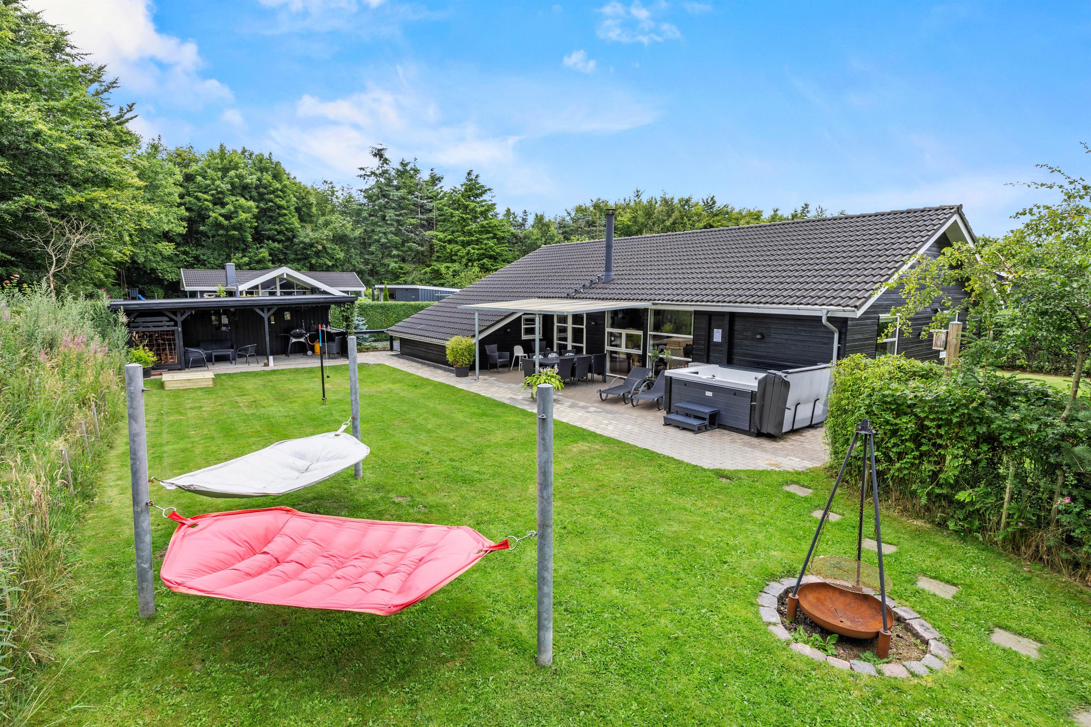 Huset har 5 smagfuldt indrettede soveværelser, alle med dobbeltsenge – perfekt til rolige nætter i fredelige omgivelser. Det veludstyrede køkken med opvaskemaskine gør ferien nemmere og giver jer mere tid til at slappe af eller tage på eventyr. Udenfor finder I både en åben og overdækket terrasse, hvor I kan nyde solen sammen. Den store græsplæne indbyder til leg og hygge for både børn og voksne – her er både sandkasse og trampolin, som børnene vil elske! Komfortable havemøbler fuldender oplevelsen og gør lune sommeraftener ekstra hyggelige.
