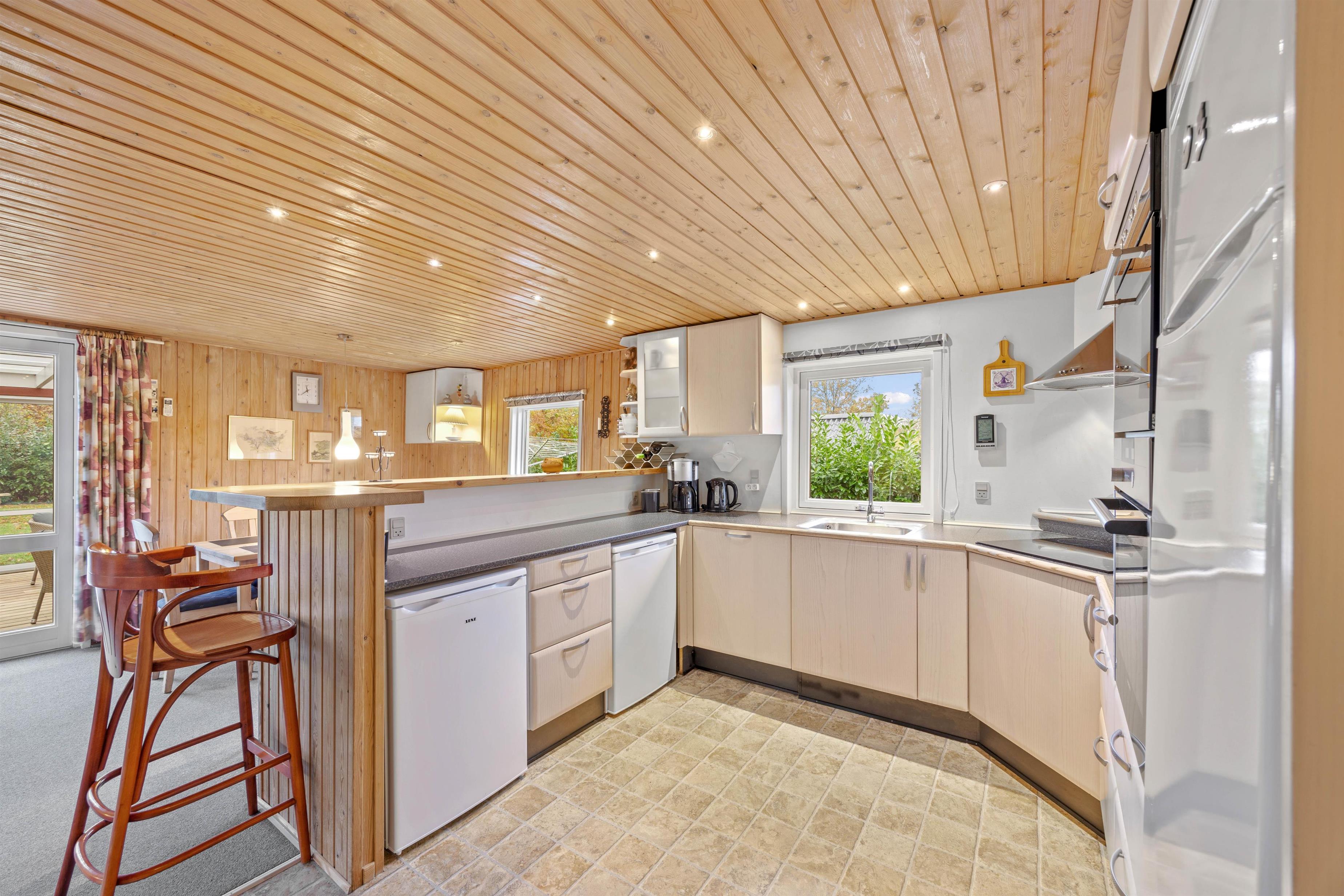 Med sine 70 m2 er her plads til 5 glade feriegæster samt 1 hund. Feriehuset er indrettet i varme brune nuancer, og her er et åbent køkken/opholdsrum til familielivet. Centralt i rummet er brændeovnen, der skaber den hyggelige feriestemning. Sid her med en god bog, en friskbrygget kop kaffe og se på den knitrende ild i brændeovnen- dét er ægte sommerhushygge. Skønt er her også en energibesparende varmepumpe, som sikrer et behageligt indeklima.