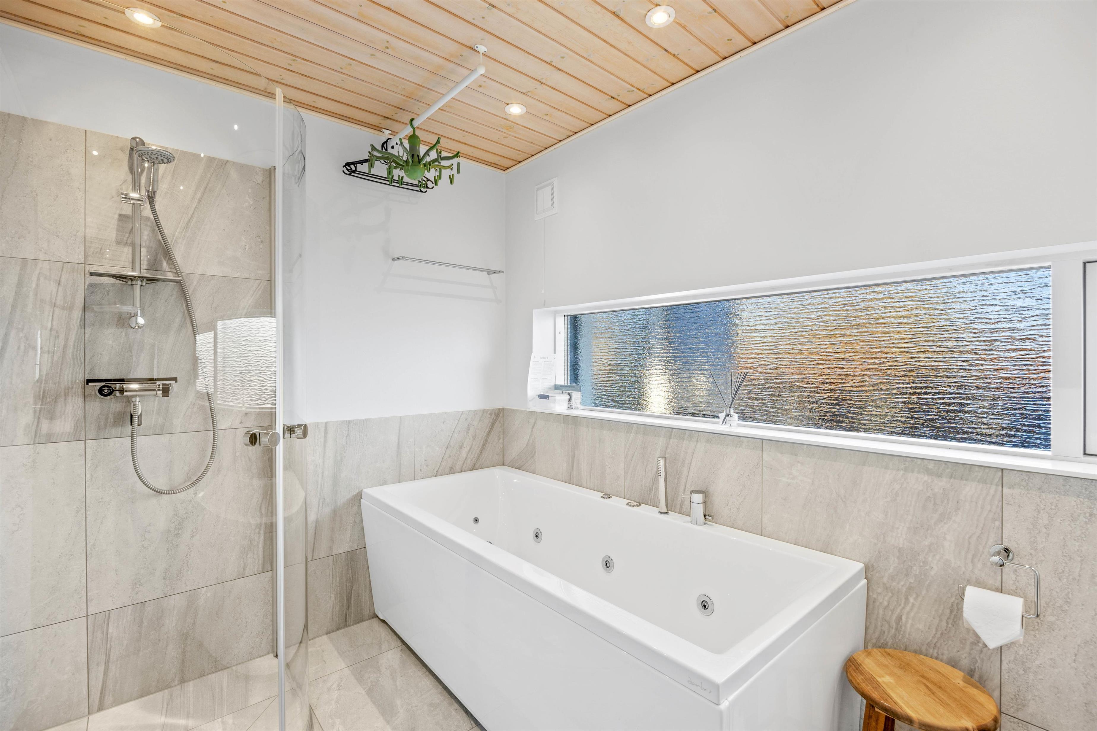 Her finder I også et badeværelse med gulvvarme samt spabad til 1 person. Det andet badeværelse ligger i det store anneks. Sommerhuset har desuden både vaskemaskine og tørretumbler, så I, om nødvendigt, kan vaske lidt tøj og håndklæder i løbet af ferien.
