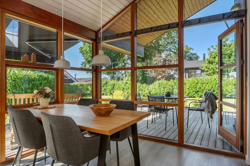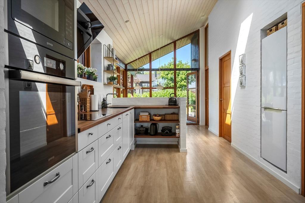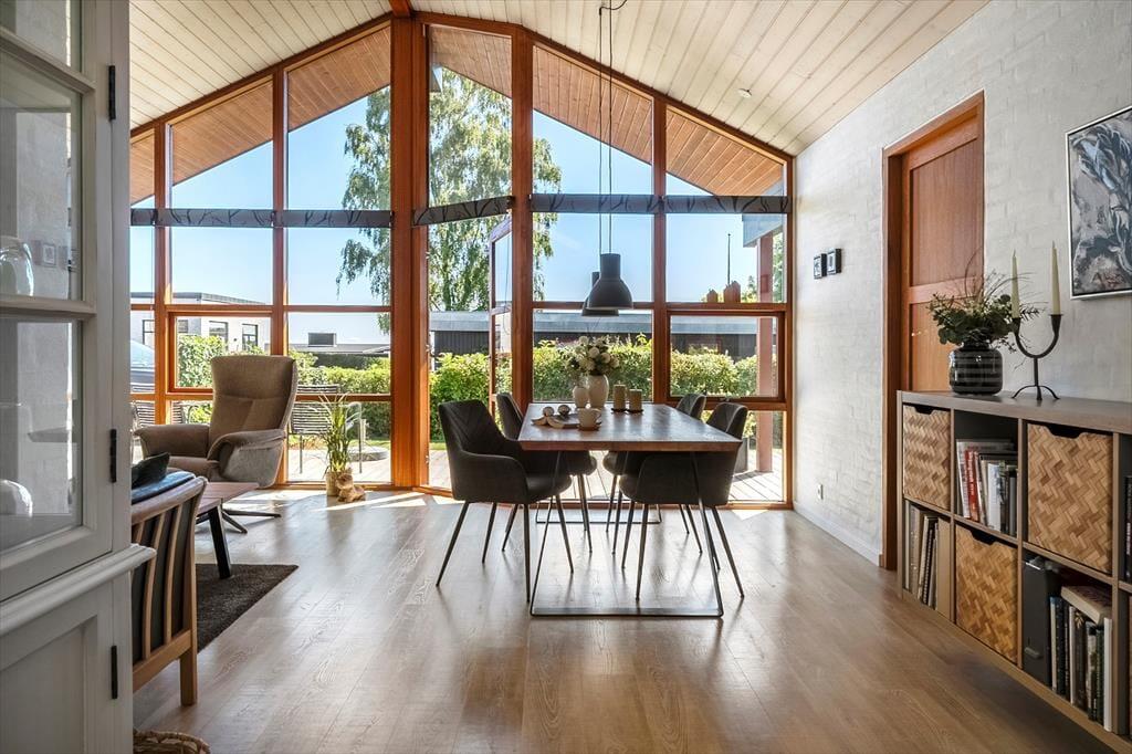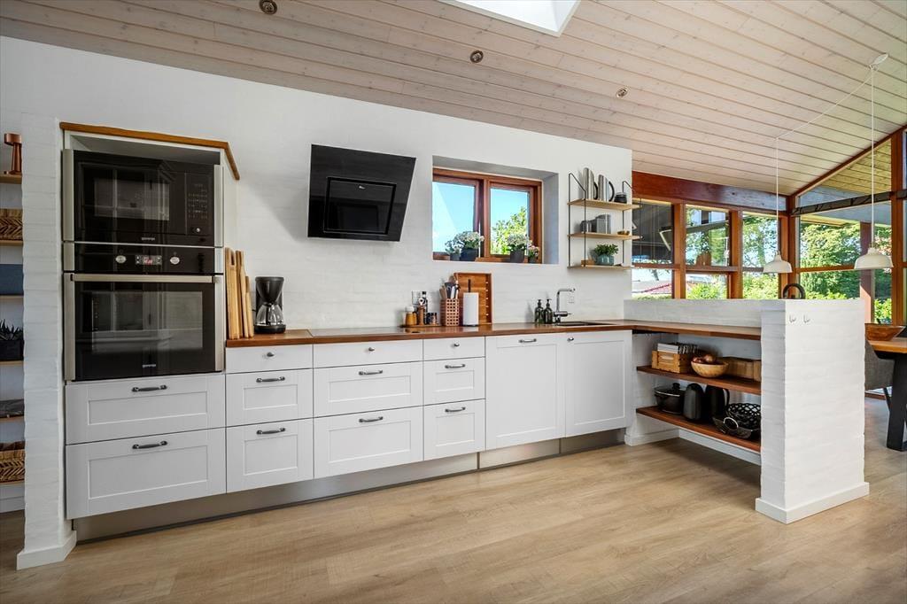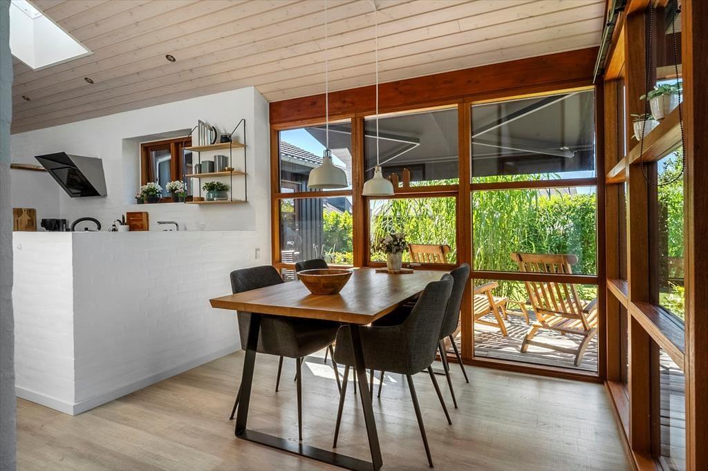 Det rummelige køkken/alrum er hjertet i huset. Køkkenet er moderne og funktionelt med god bordplads, integrerede ovne, smukke træbordplader og vinduer, der giver et dejligt naturligt lys. Spiseområdet ligger perfekt placeret ud mod de store vinduespartier, hvor udsigten til haven og et glimt af vandet skaber en rolig og inspirerende stemning.