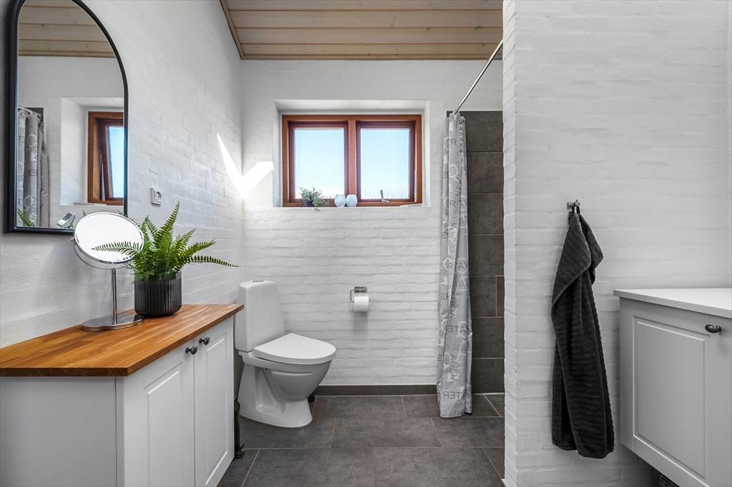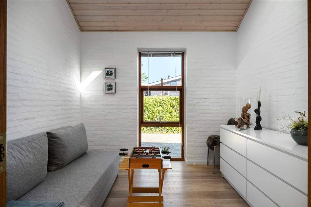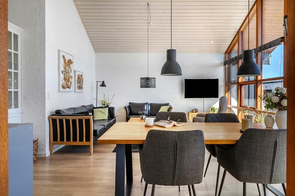 Træd indenfor i et lyst og indbydende sommerhus, hvor store vinduespartier og en smuk loftshøjde skaber en åben og luftig atmosfære. Fra første øjeblik mærker man, at huset er gennemført i både stil og kvalitet: lyse trælofter, hvide murstensvægge, varme trædetaljer og moderne interiør går hånd i hånd og gør opholdsrummet til et naturligt samlingspunkt.