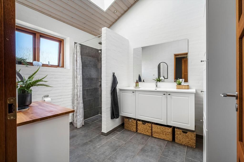 Badeværelset er flot og renoveret med separat bruseniche, god skabsplads, store fliser og et lækkert lysindfald fra ovenlysvinduet.