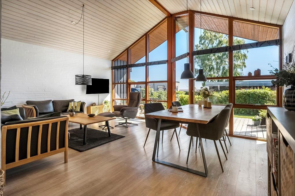 Stuen ligger i direkte forlængelse og byder på hyggelige møbleringsmuligheder og masser af lys. De store gulv-til-loft vinduer trækker naturen helt ind i rummet og skaber et smukt, levende bagtæppe til ferielivet.
