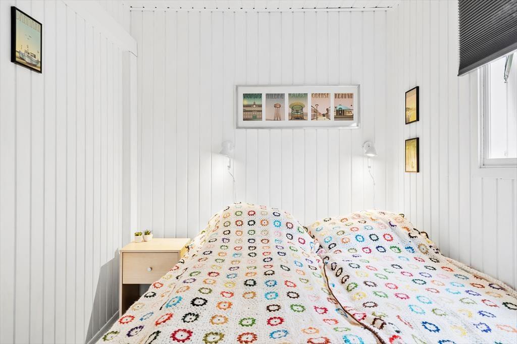 Sommerhuset har god plads til fem voksne eller børn. Sovepladserne er fordelt i to soverum med dobbeltsenge og en sovesofa i stuen.