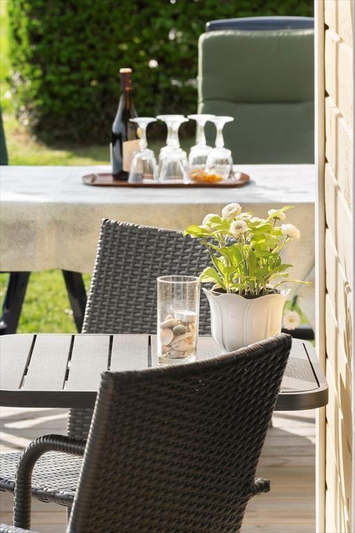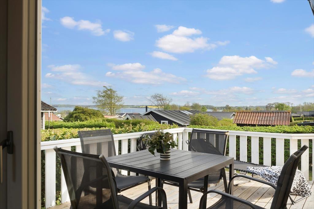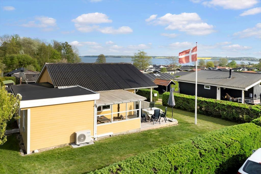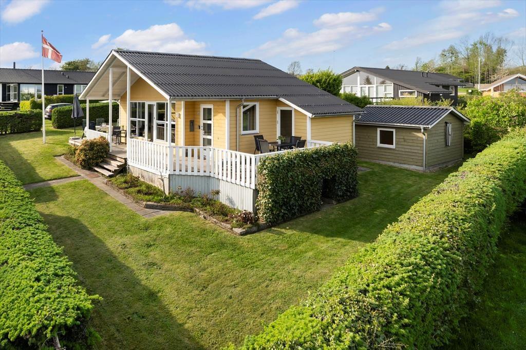 Sommerhuset ligger højt på en grund, hvilket giver en dejlig udsigt over området og mod fjorden. Her finder du flere terrasser med små hyggekroge, så du altid kan finde den perfekte plads – hvad enten du vil nyde morgensolen, spise frokost i læ eller sidde under den overdækkede del, når aftenen falder på. Haven indbyder til leg og afslapning, og beliggenheden for enden af en rolig vej skaber trygge rammer for både børn og voksne. Den korte afstand til legepladsen gør det ekstra nemt for børnene at få nye oplevelser, mens de voksne kan nyde en stille stund på terrassen med udsigten som selskab.