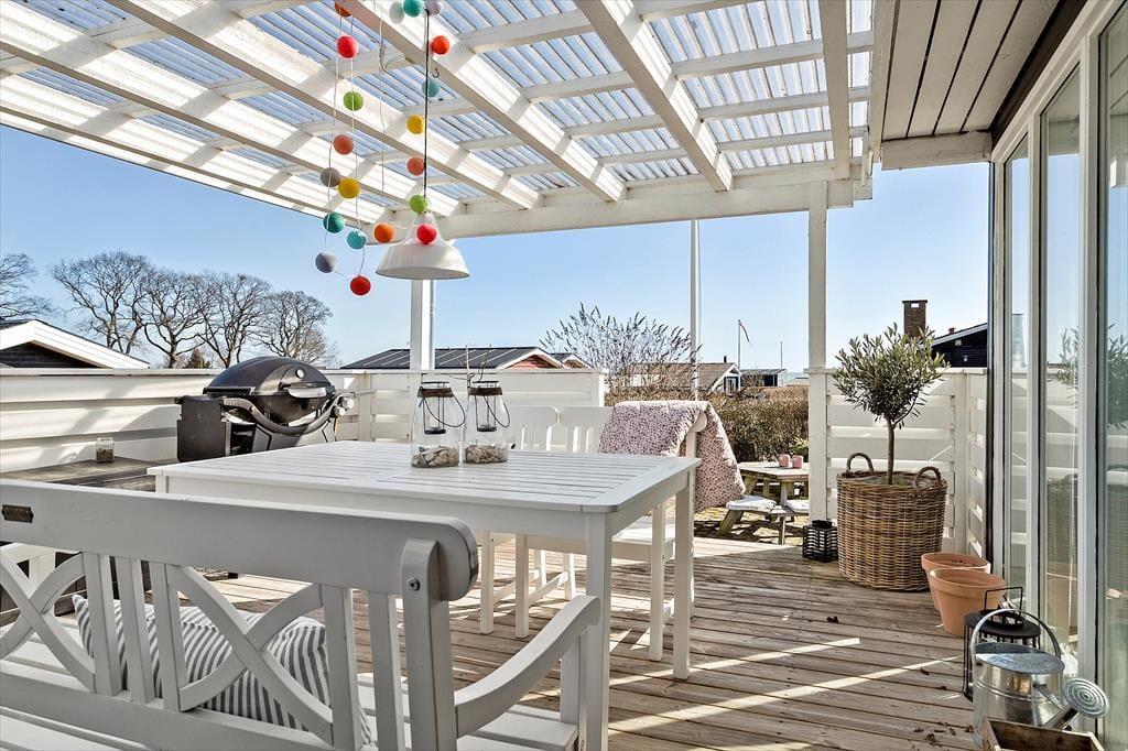 Til huset hører flere hyggelige terrassekroge – både overdækkede og åbne. Hver terrasse har gode havemøbler, så I kan nyde udelivet hele dagen. Haven er lukket og ugeneret, så I frit kan solbade på liggestolene eller bare nyde den friske luft.