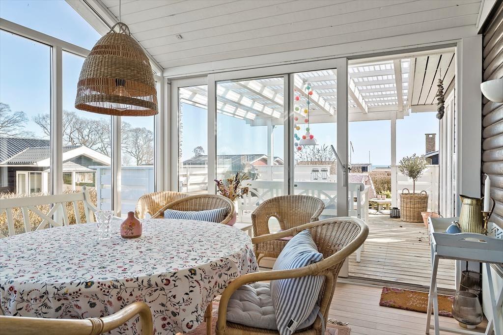 Når du træder ind ad hoveddøren, kommer du ind i husets dejlige havestue, hvor du mødes af en skøn udsigt og komfortabelt møblement. Havestuen fungerer også som spiseafdeling. Herfra er der adgang til resten af huset.