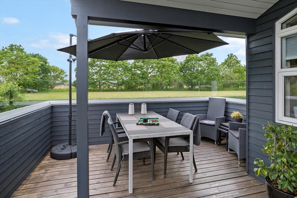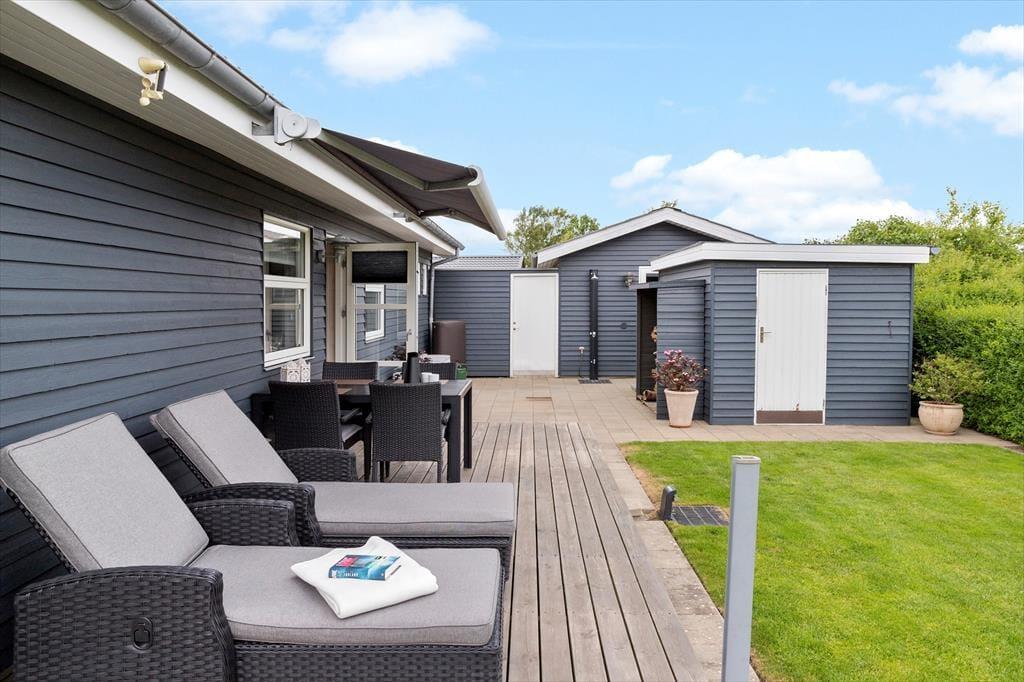 Dette sommerhus ligger i et skønt sommerhusområde med kun 300 m. til en god sandstrand. På husets to terrasser finder i gode havemøbler, så I kan sidde behageligt og nyde udelivet. Hvis I vil solbade er der flere liggestole, som I kan dase i med en god bog. Derudover er der mulighed for at tilberede feriens måltider på husets gasgrill. I haven er der plads til fri leg og