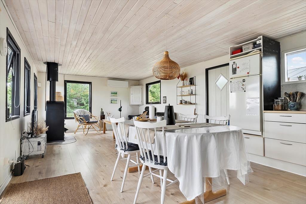 Stuen er i direkte forbindelse med spisepladsen og køkkenet, så alle kan hygge sig sammen – også når måltiderne skal tilberedes. De store vinduer i stuen lader det naturlige lys strømme ind og skaber en lys og luftig atmosfære, der indbyder til ro og afslapning. Her kan du fordybe dig i en god bog med en kop kaffe, sænke skuldrene og lade dagligdagens stress forsvinde i det fredfyldte miljø eller bare nyde den skønne udsigt.
