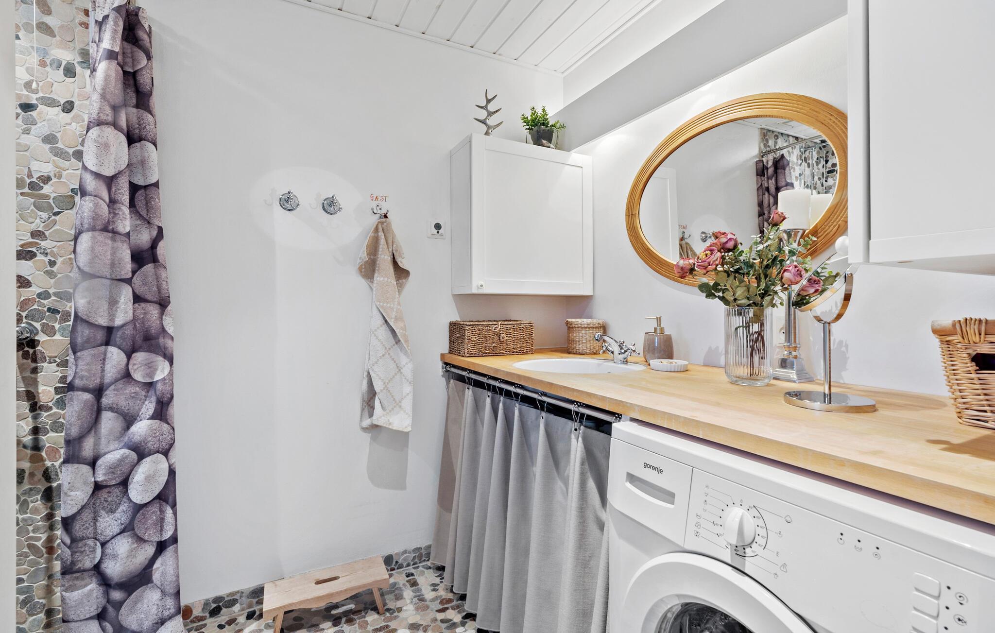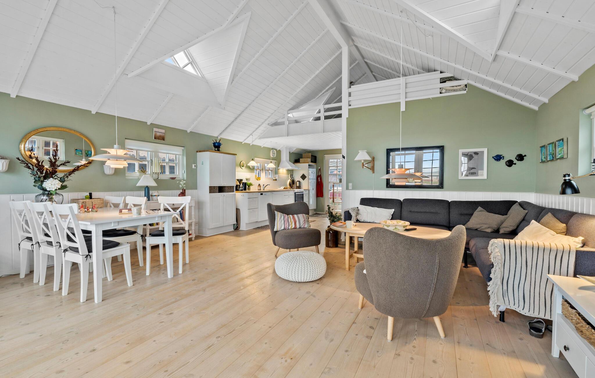 Velkommen til den indbydende atmosfære i det lyse interiør, hvor højt til loftet og smagfuld indretning skaber en ægte feel-good-stemning. Lav mad sammen i det moderne køkken, nyd hyggelige måltider i den hyggelige spiseplads og afslut aftenen med en film eller et spil brætspil i den stilfulde stue.